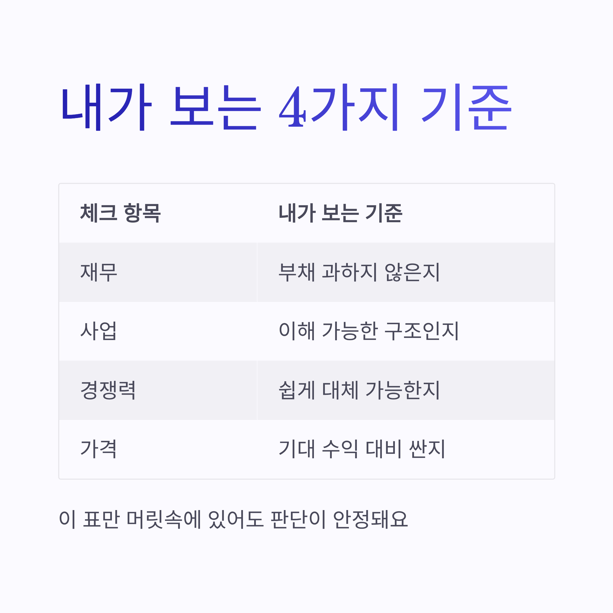 정리해보면 이거예요. 투자가 어려운 이유는 정보가 많아서가 아니라, 기준이 없어서입니다.