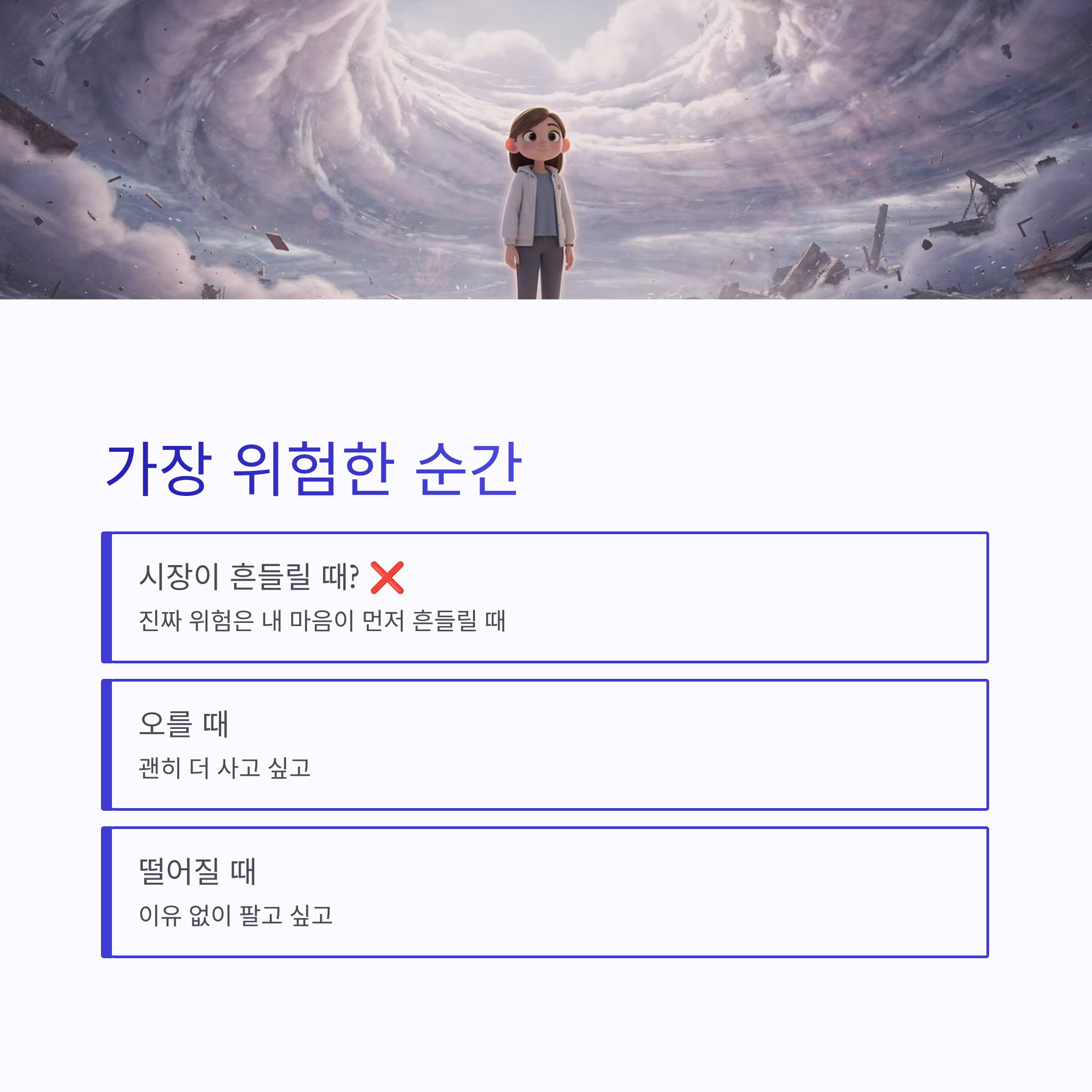 투자에서 제일 위험한 순간은 시장이 흔들릴 때가 아니라, 내 마음이 먼저 흔들릴 때더라구요. 오를 땐 괜히 더 사고 싶고, 떨어지면 이유 없이 팔고 싶고… 다 겪어봤죠 ㅠㅠ