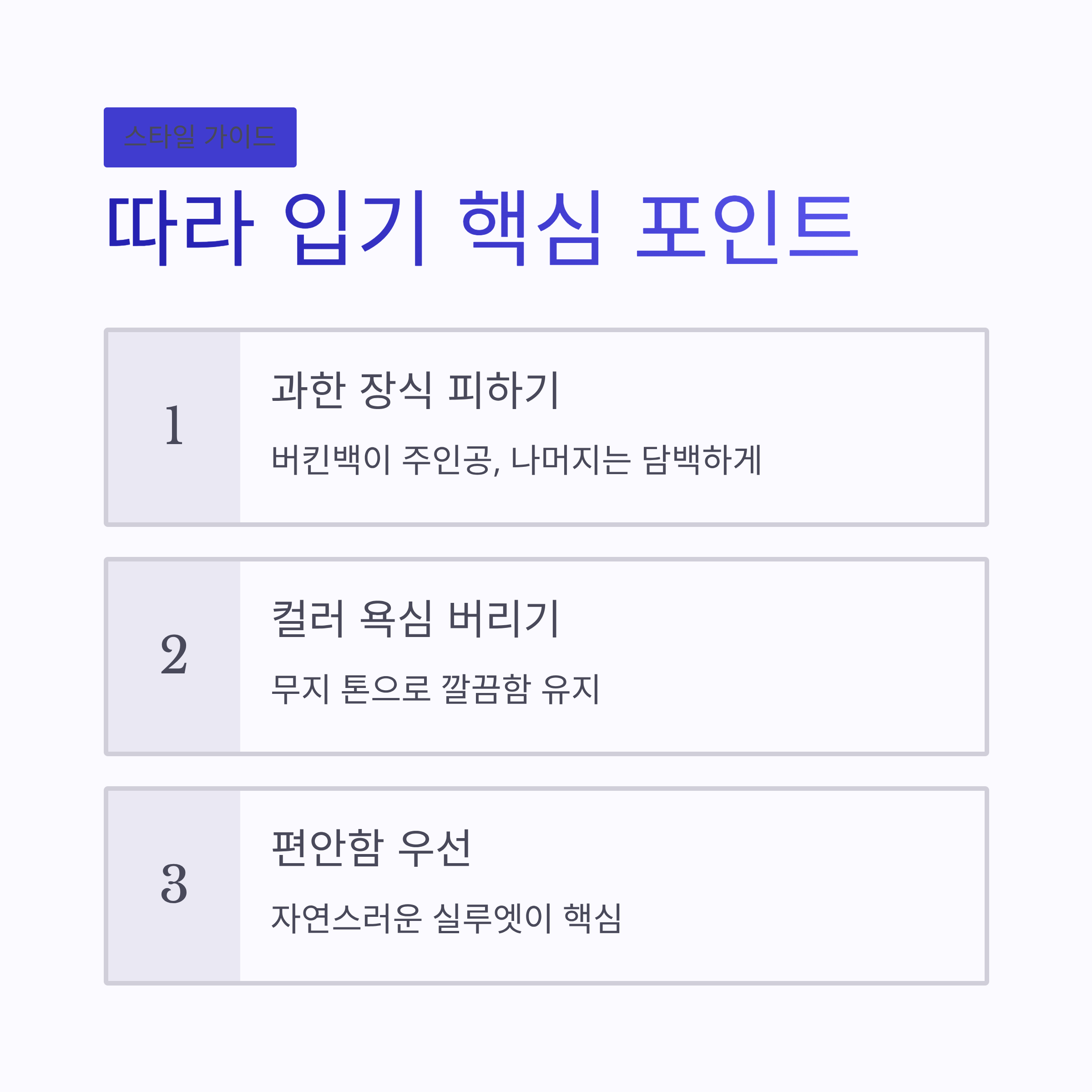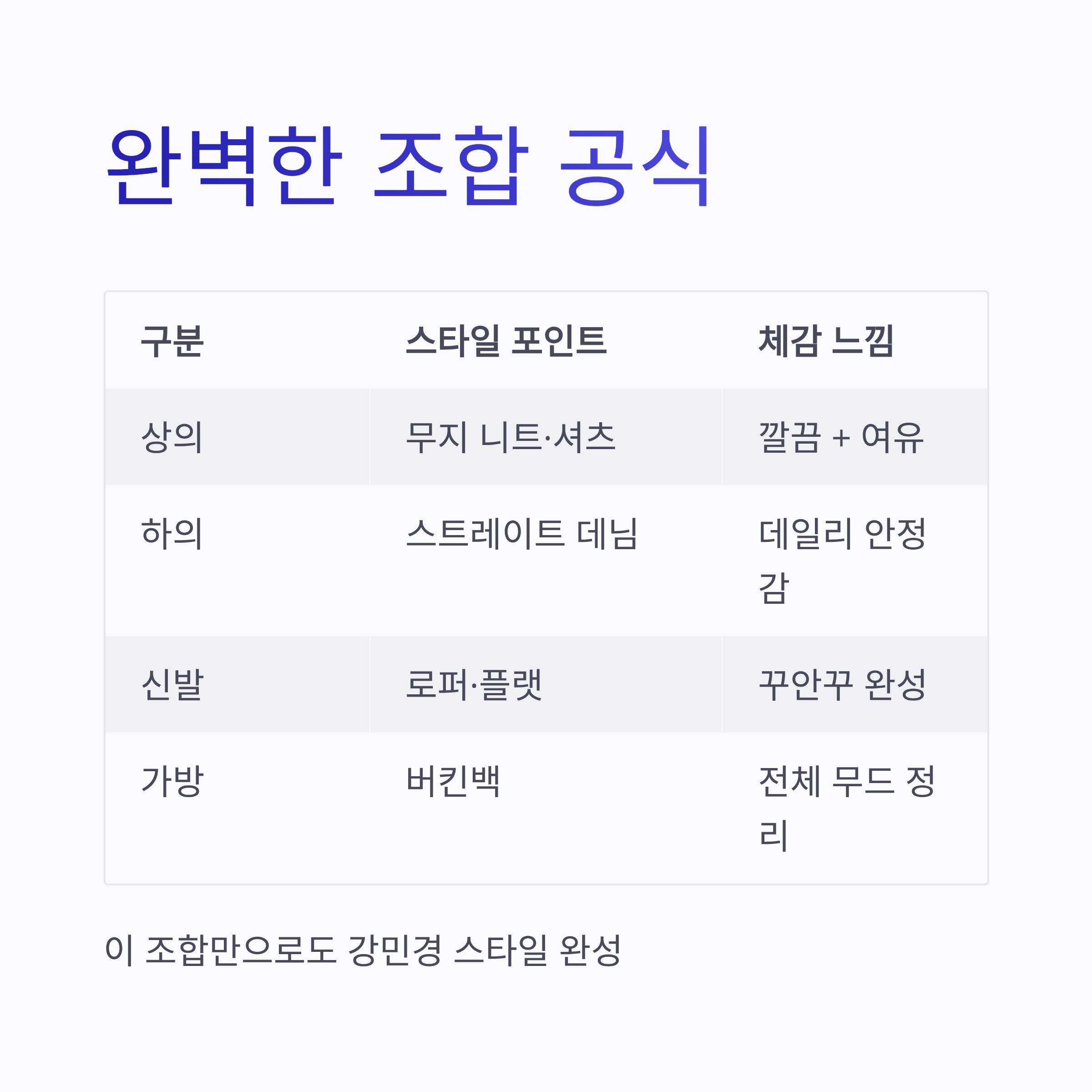 | 구분 | 스타일 포인트 | 체감 느낌 | | -- | -------- | -------- | | 상의 | 무지 니트·셔츠 | 깔끔 + 여유 | | 하의 | 스트레이트 데님 | 데일리 안정감 | | 신발 | 로퍼·플랫 | 꾸안꾸 완성 | | 가방 | 버킨백 | 전체 무드 정리 |