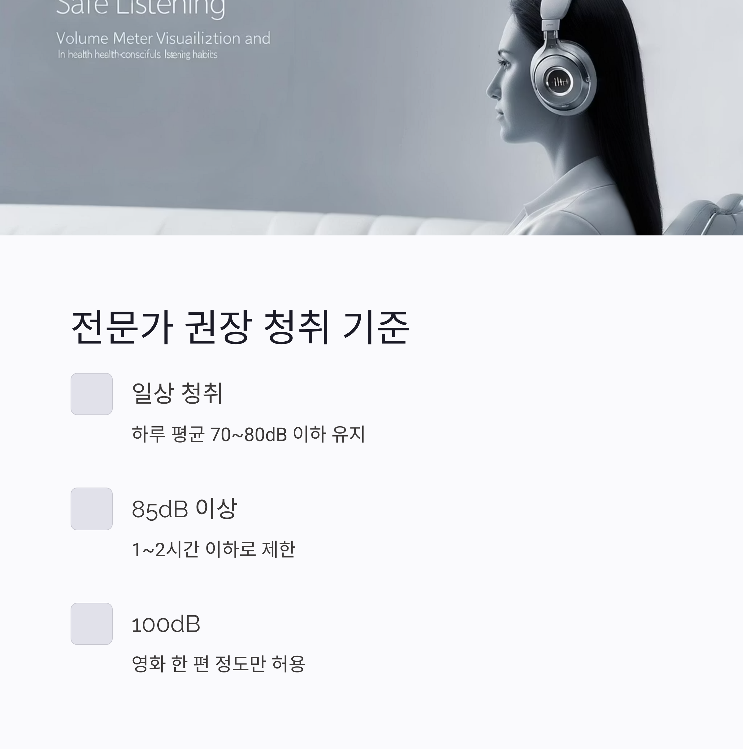 - 되도록이면 하루 청취 평균은 70~80dB 이하!