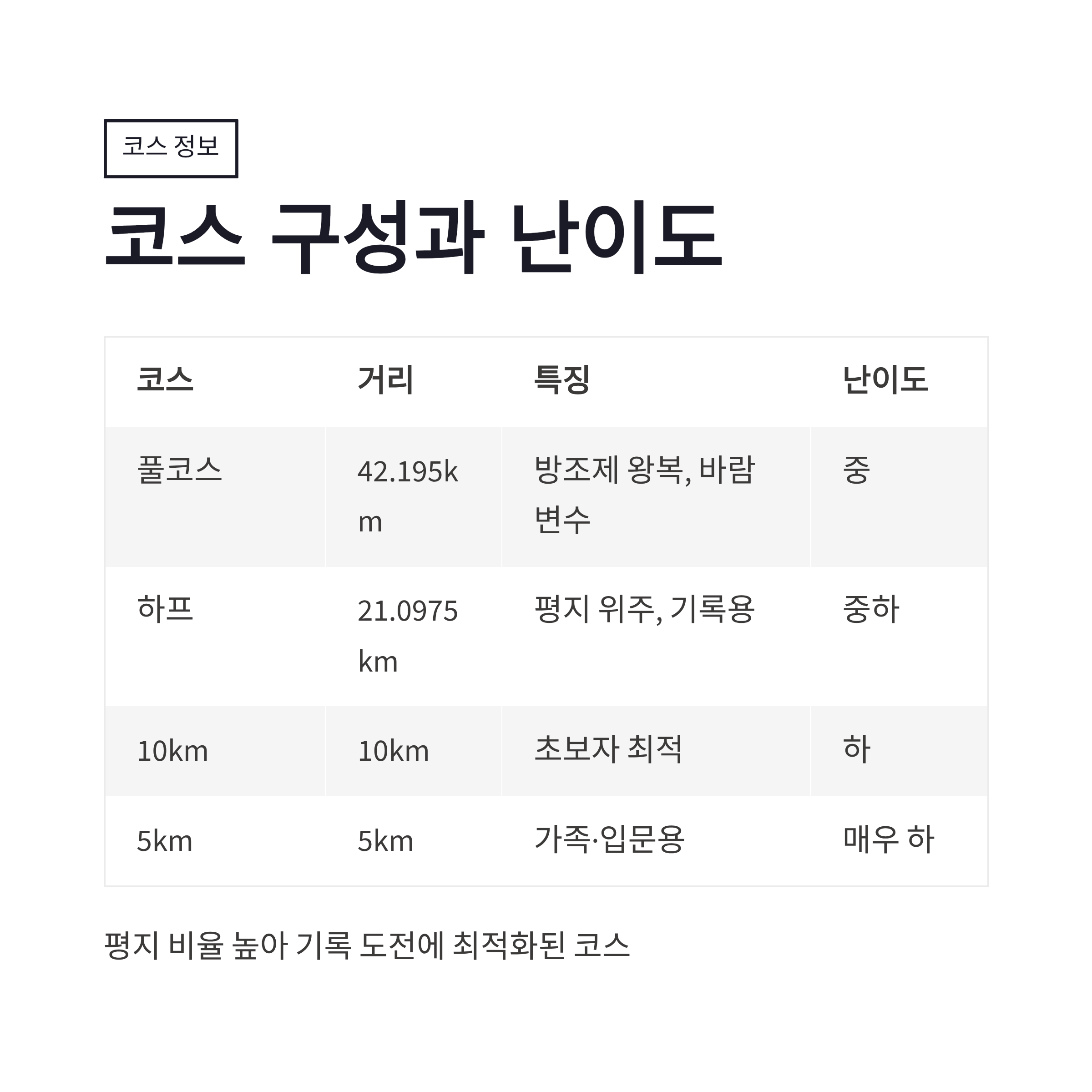 | 코스 구분 | 거리 | 특징 | 체감 난이도 |
