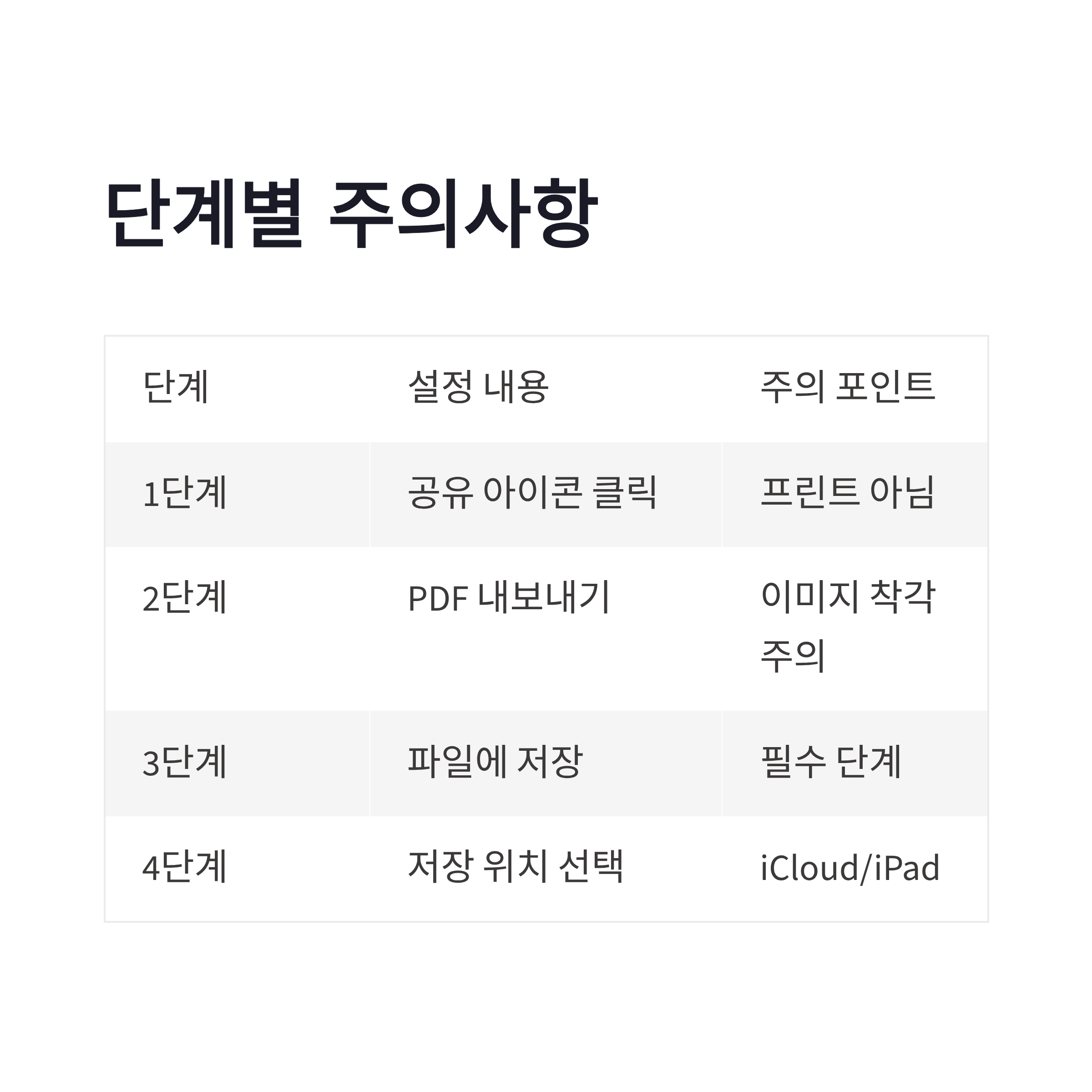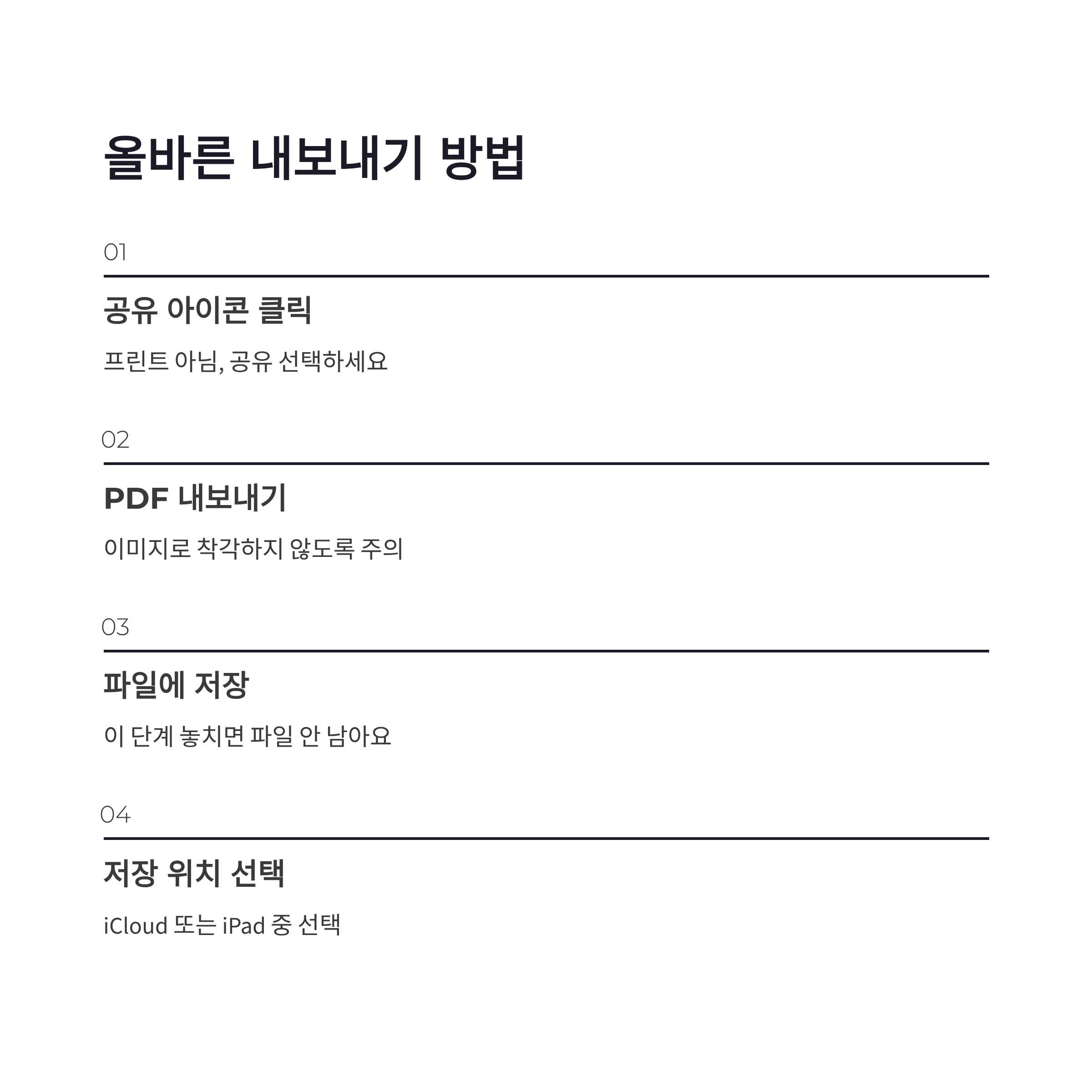 | 단계 | 설정 내용 | 주의 포인트 | | -- | --------- | ------------------ | | 1 | 공유 아이콘 클릭 | 프린트 아님, 공유 선택 | | 2 | PDF 내보내기 | 이미지로 착각 주의 | | 3 | 파일에 저장 | 이 단계 놓치면 파일 안 남음 | | 4 | 저장 위치 선택 | iCloud / iPad 중 선택 |