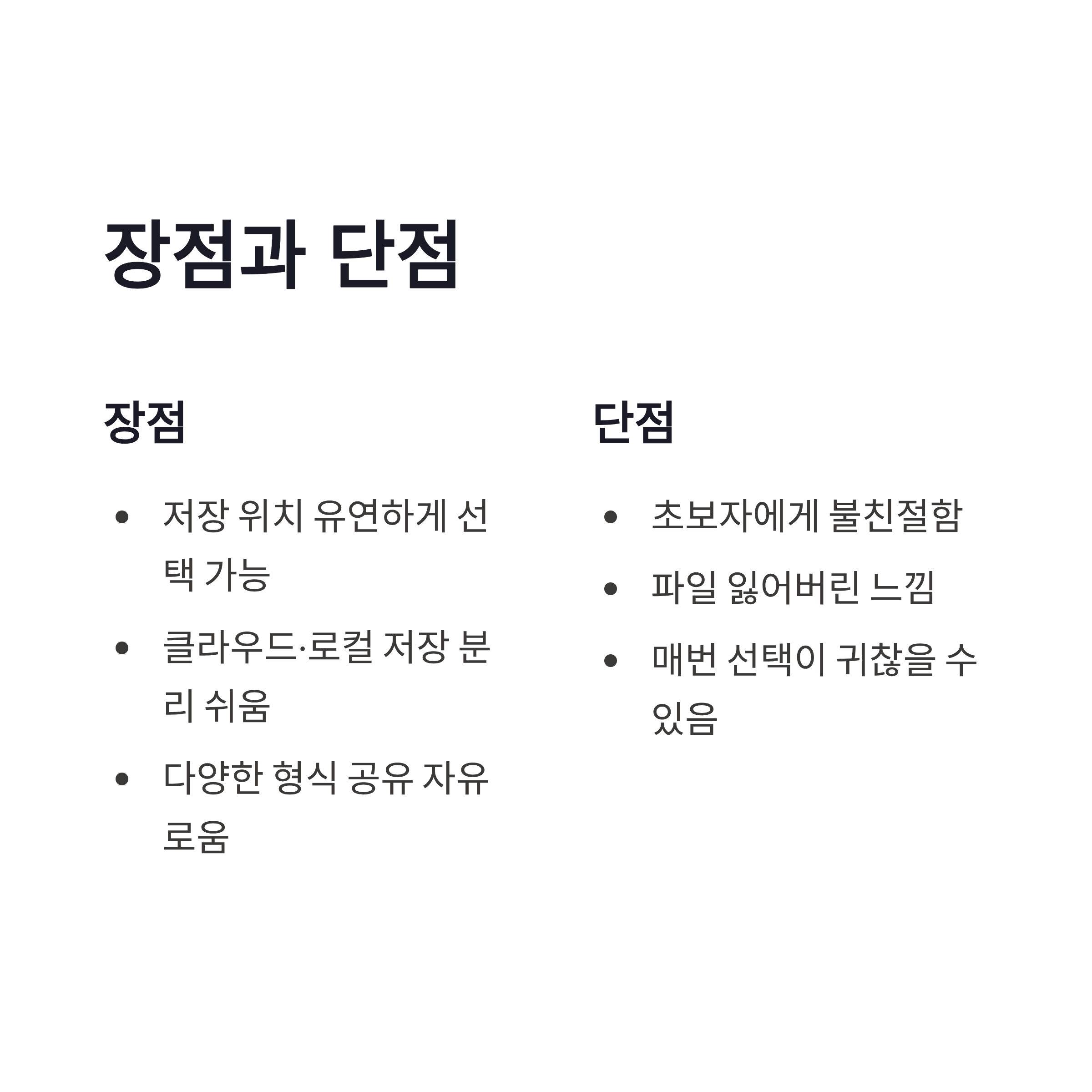 * 저장 위치를 상황별로 유연하게 선택 가능 * 클라우드·로컬 저장 분리 쉬움 * PDF 외에도 이미지, 링크 공유 자유로움