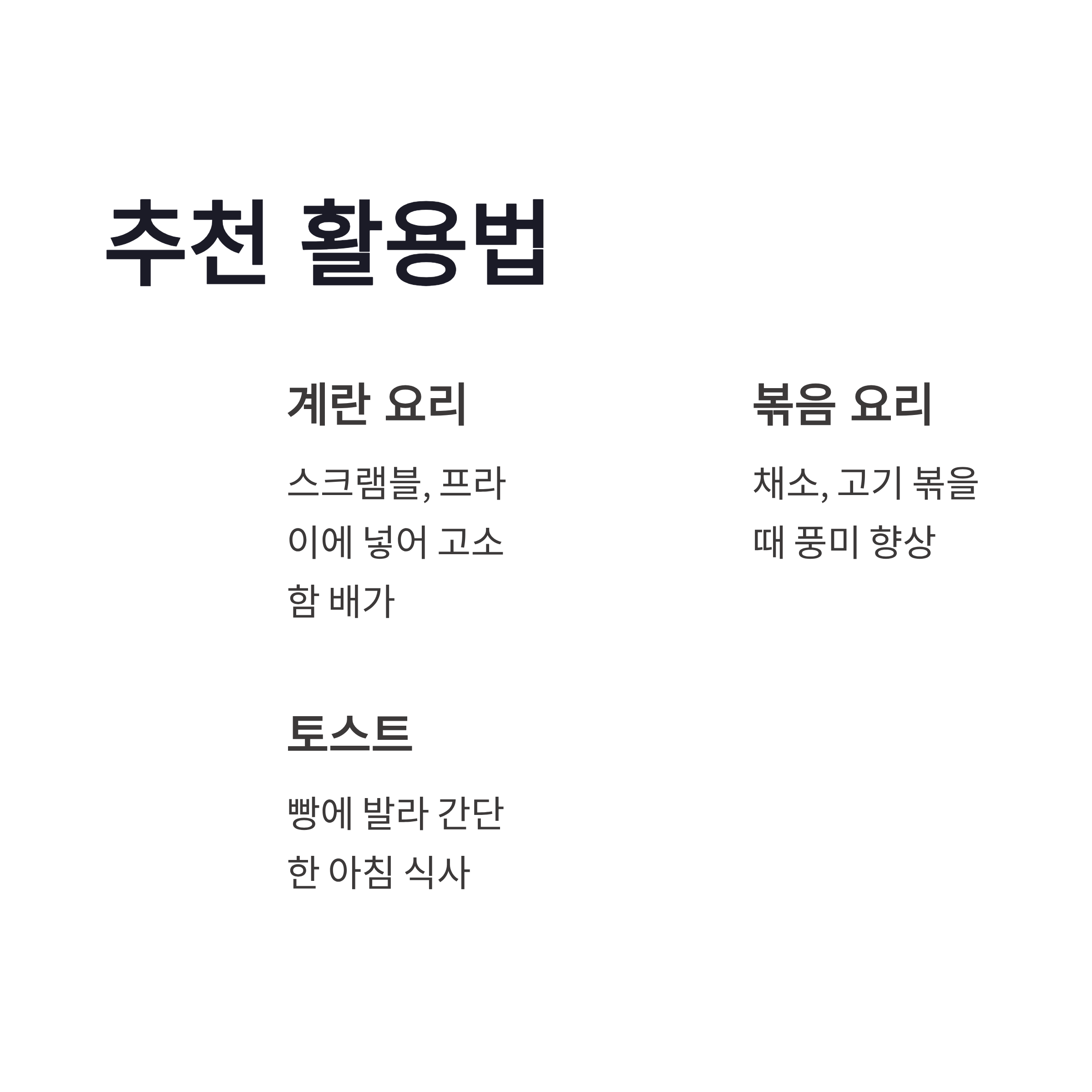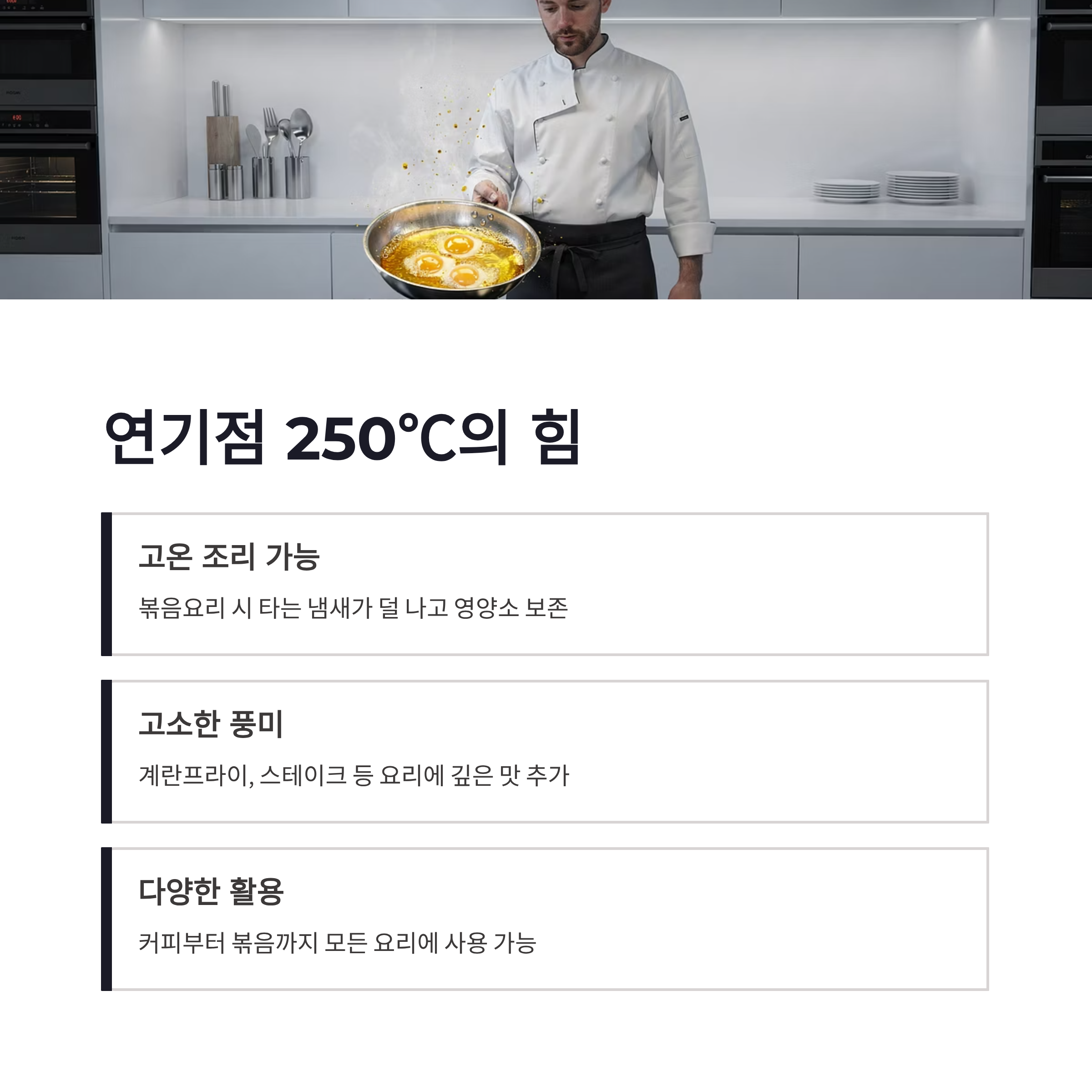 특히 연기점이 높아서 볶음요리할 때 타는 냄새가 덜 나요. 전 계란프라이 해먹을 때 이 차이가 제일 크게 느껴졌어요. 고소함이 진짜 다르더라구요.