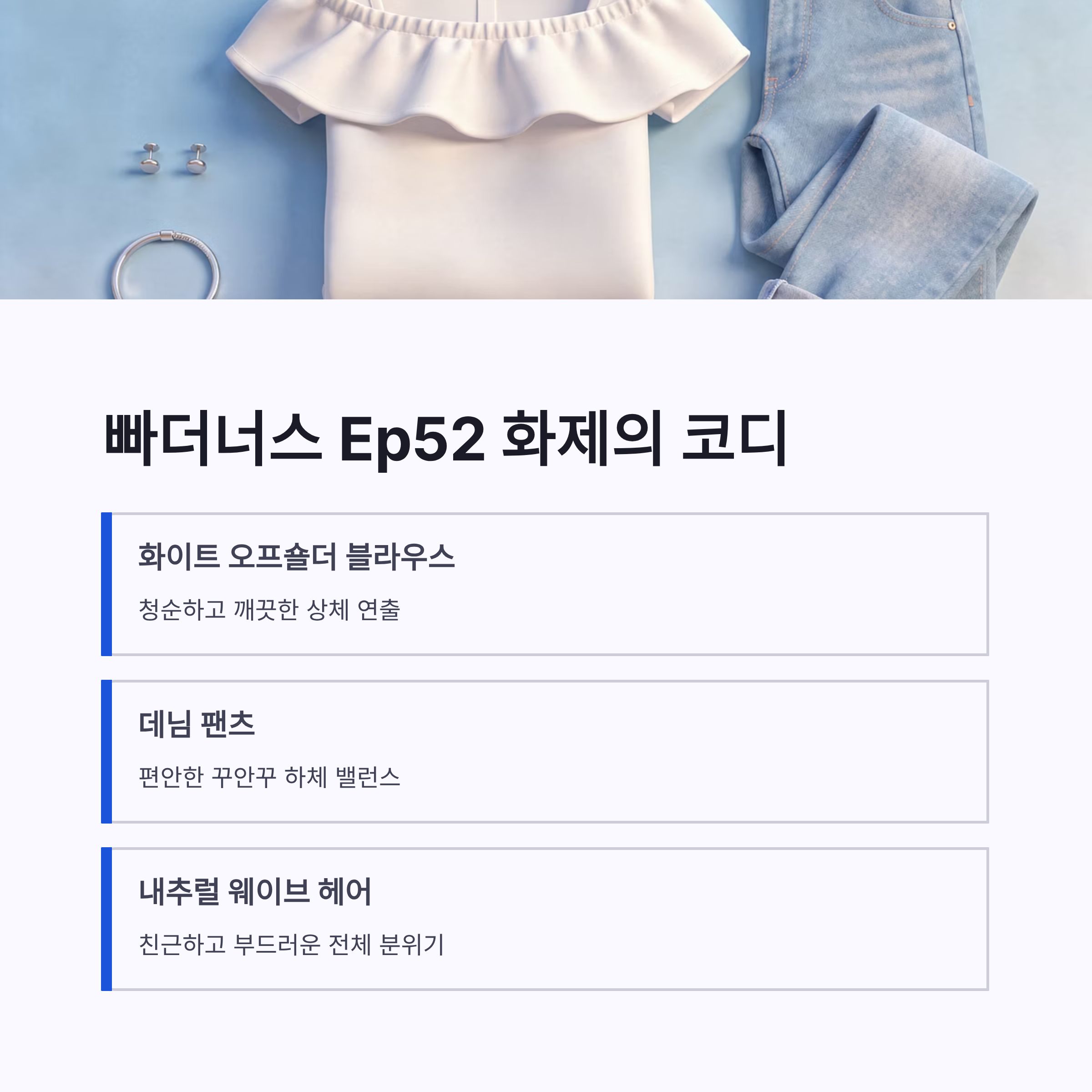 ‘빠더너스’ Ep52에서 보여준 김유정 오프숄더는 진짜 반응 폭발이었죠. 화이트 오프숄더 블라우스에 데님 팬츠 조합, 이게 말은 쉬운데 실제로 입으면 은근 어려운데요. 김유정은 그걸 너무 자연스럽게 소화하더라구요. 상체는 여리여리, 하체는 캐주얼하게 눌러주니까 전체 밸런스가 딱 맞았어요.