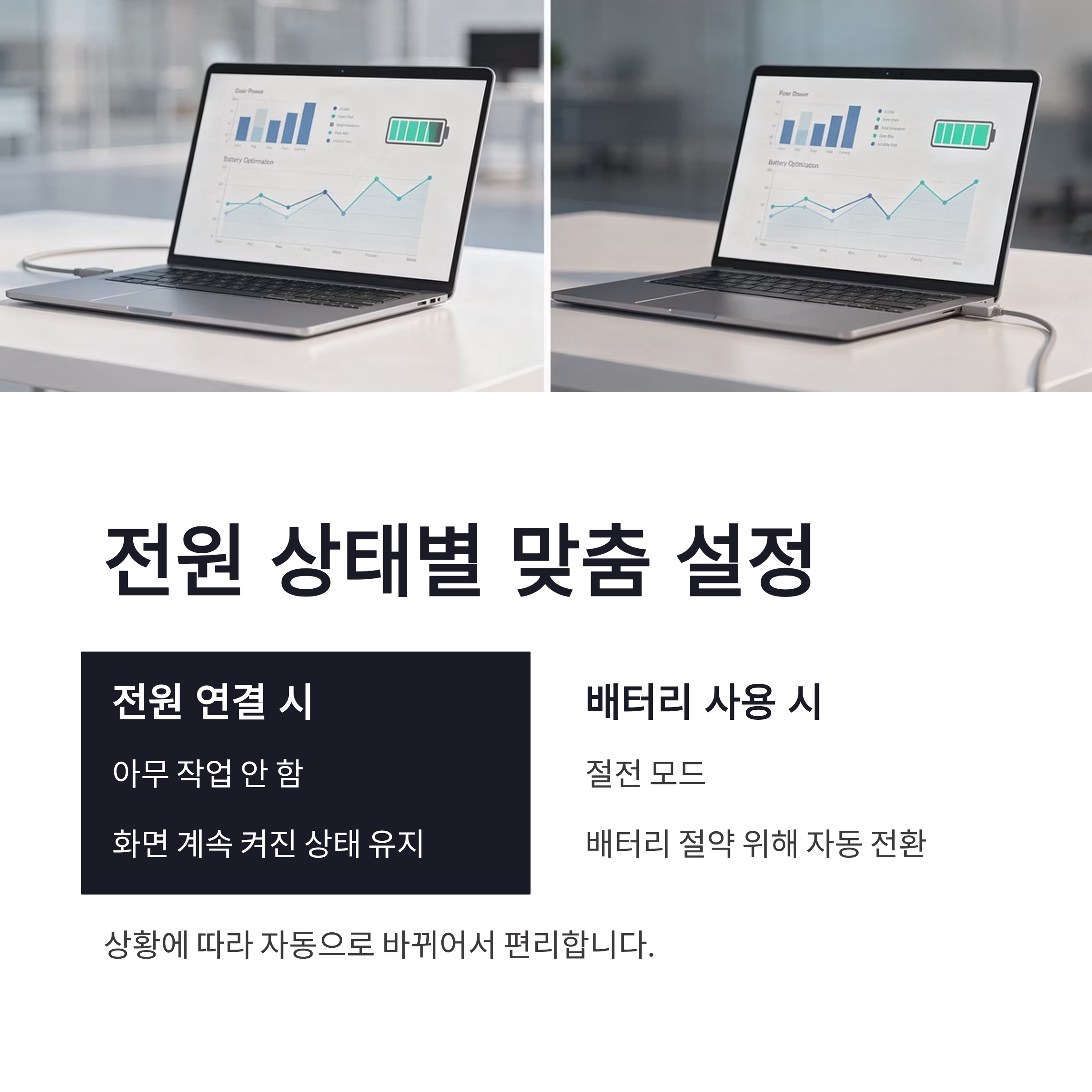 여기서 포인트는 전원 연결 상태와 배터리 사용 중을 따로 설정할 수 있다는 점이구요. 저는 전원 연결 시에는 ‘아무 작업 안 함’, 배터리일 때는 절전으로 해놨습니다. 이렇게 해두면 상황 따라 자동으로 잘 바뀌어서 꽤 편하더라구요. 이후 저장만 눌러주면 노트북 덮개 닫기 설정 끝입니다. 생각보다 허무할 정도로 간단했어요 ㅎㅎ