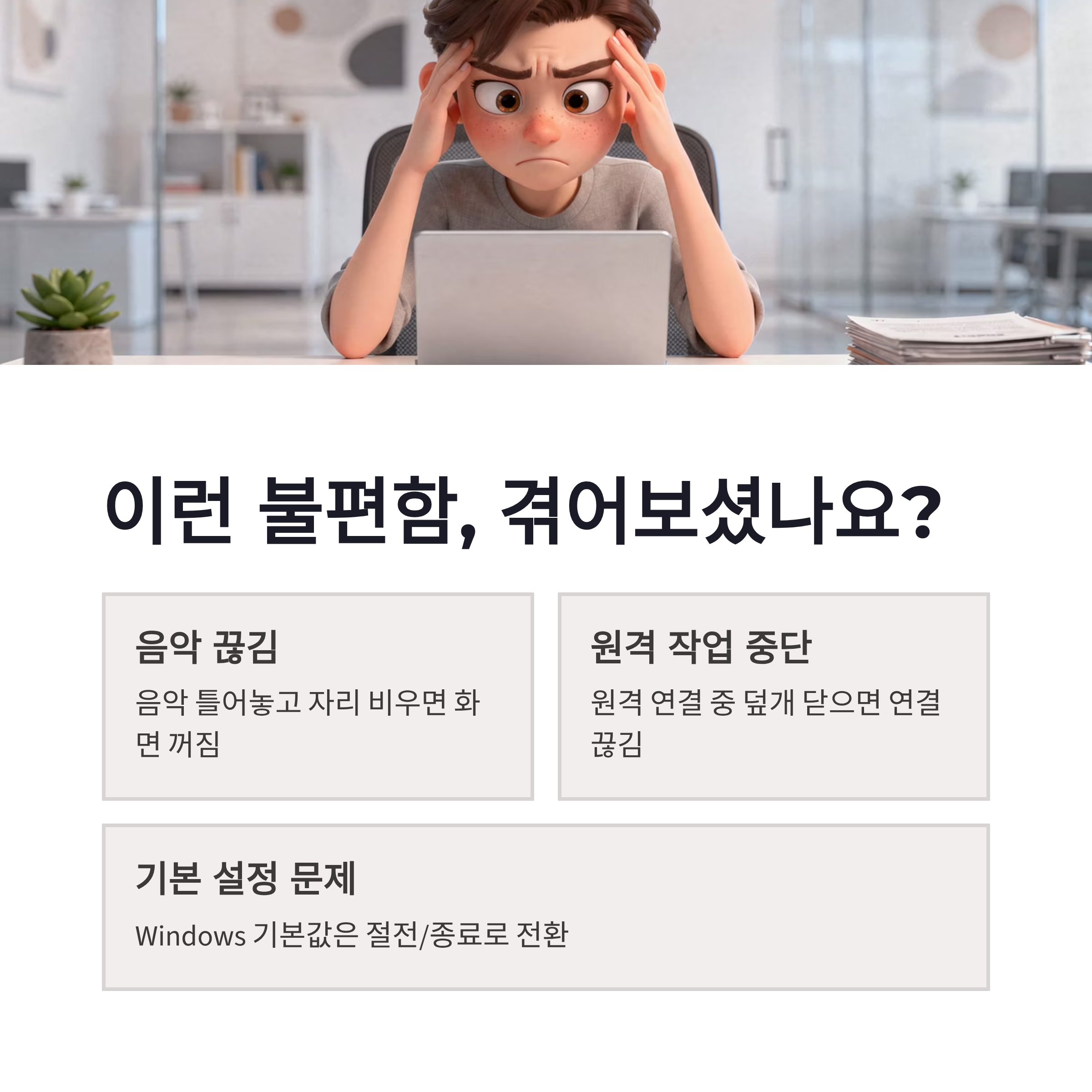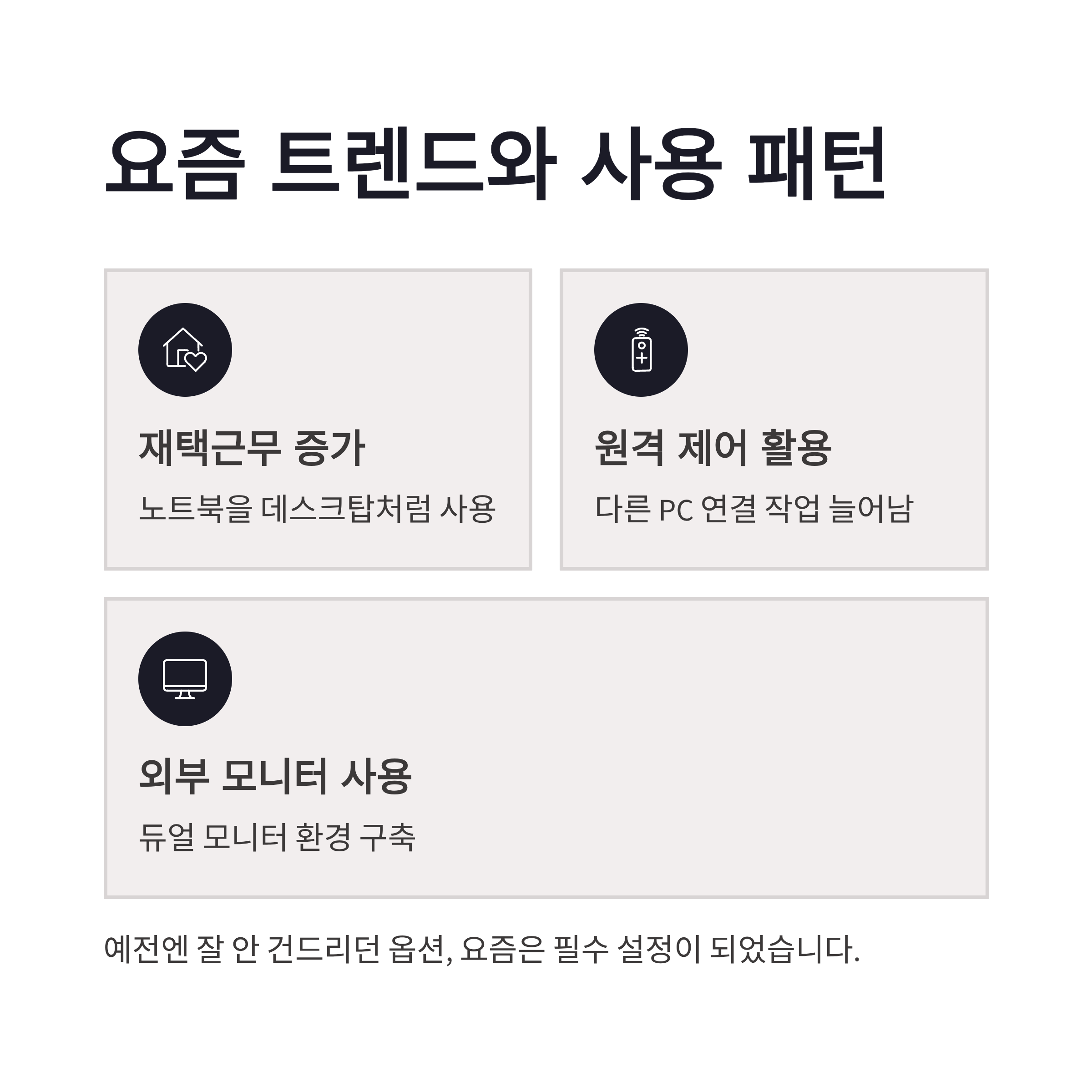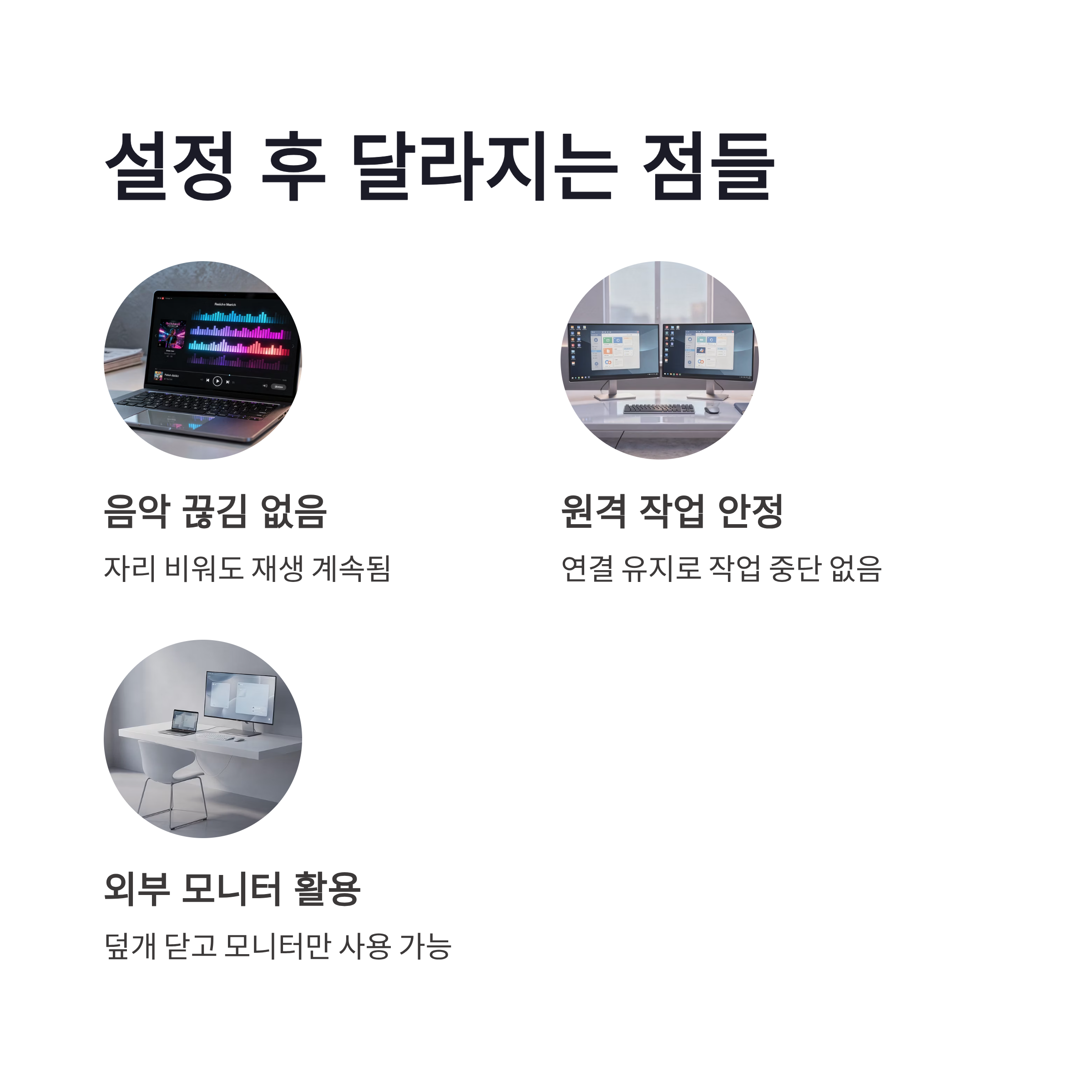 이 설정을 바꾸고 나서 느낀 장점은 확실했는데요. 음악 끊김 없음, 원격 작업 안정성, 모니터 외부 연결 시 활용도… 다 체감됐습니다. 요즘처럼 노트북을 데스크탑처럼 쓰는 환경에서는 노트북 덮개 닫기 설정이 거의 필수 같더라구요.