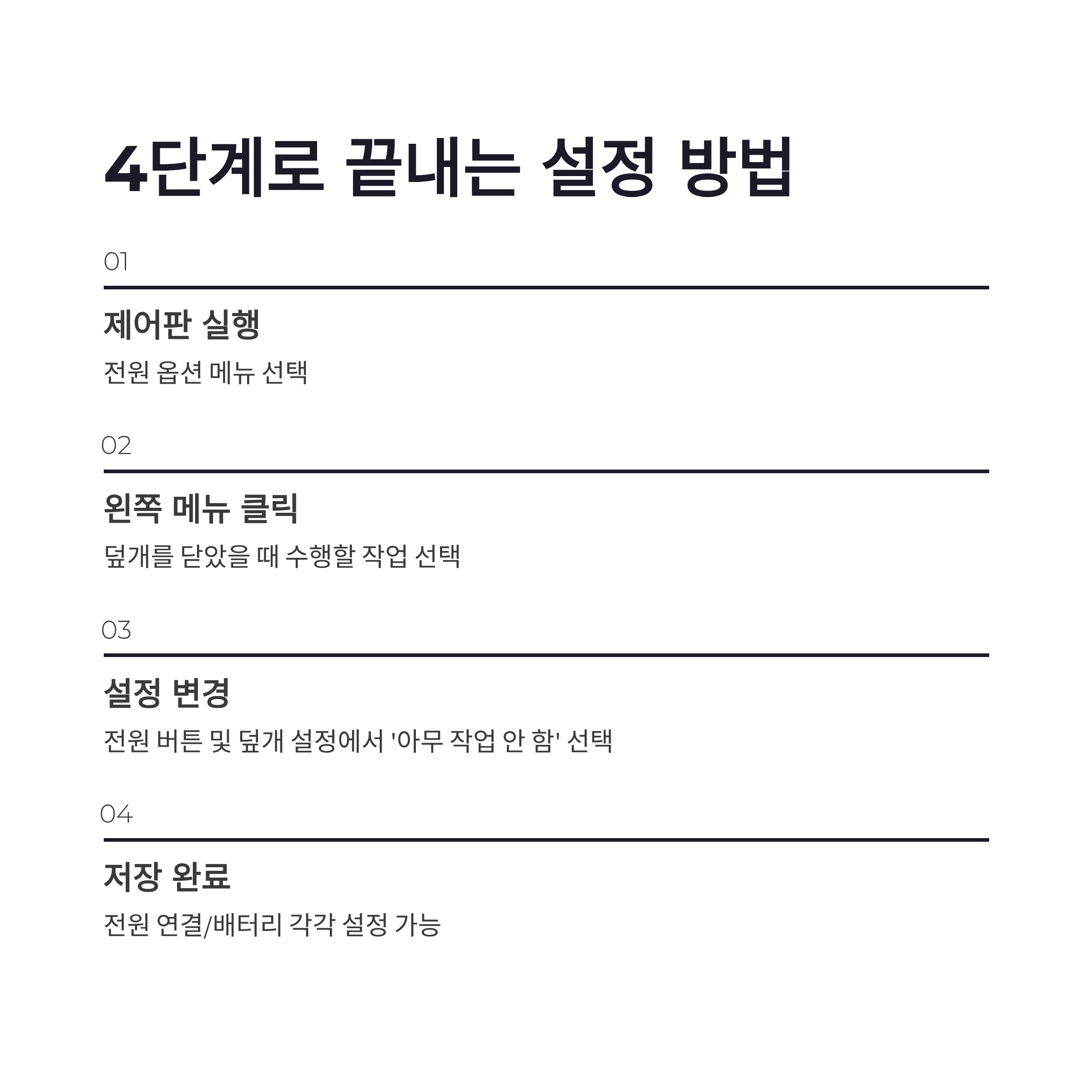 | 단계 | 설정 경로 | 선택 항목 | | -- | ------------- | ------------------- | | 1 | 제어판 실행 | 전원 옵션 | | 2 | 왼쪽 메뉴 | 덮개를 닫았을 때 수행할 작업 선택 | | 3 | 전원 버튼 및 덮개 설정 | 아무 작업 안 함 | | 4 | 전원 연결/배터리 | 각각 설정 가능 |