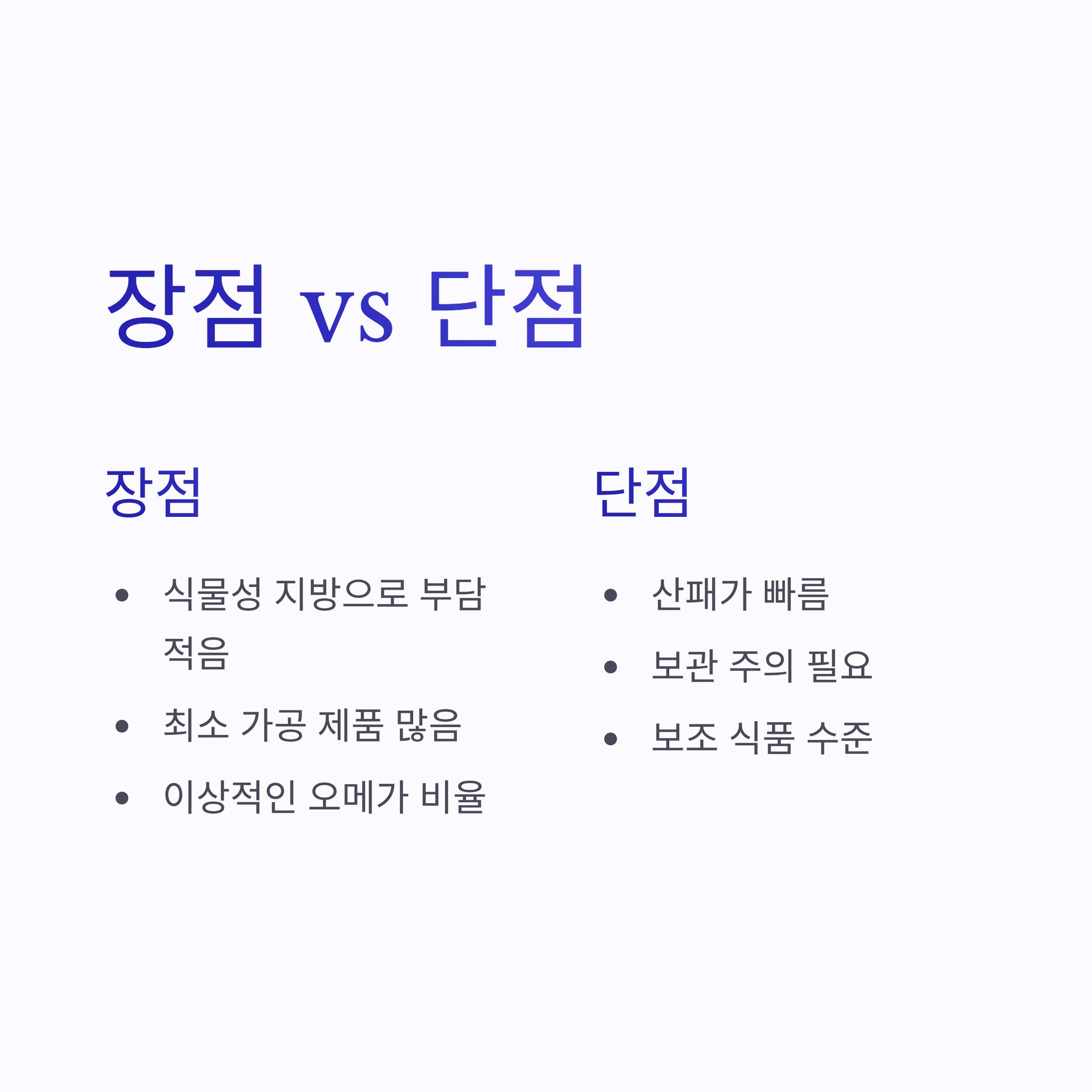 장점은 확실합니다. 식물성 지방이라 부담이 적고, 가공이 최소화된 제품이 많아요. 반대로 단점이라면 산패가 빠르다는 점… 그래서 보관 진짜 중요합니다. 또 만병통치약처럼 기대하면 실망할 수도 있어요. 어디까지나 *보조 식품*이라는 점, 이건 꼭 짚고 가야겠쥬?