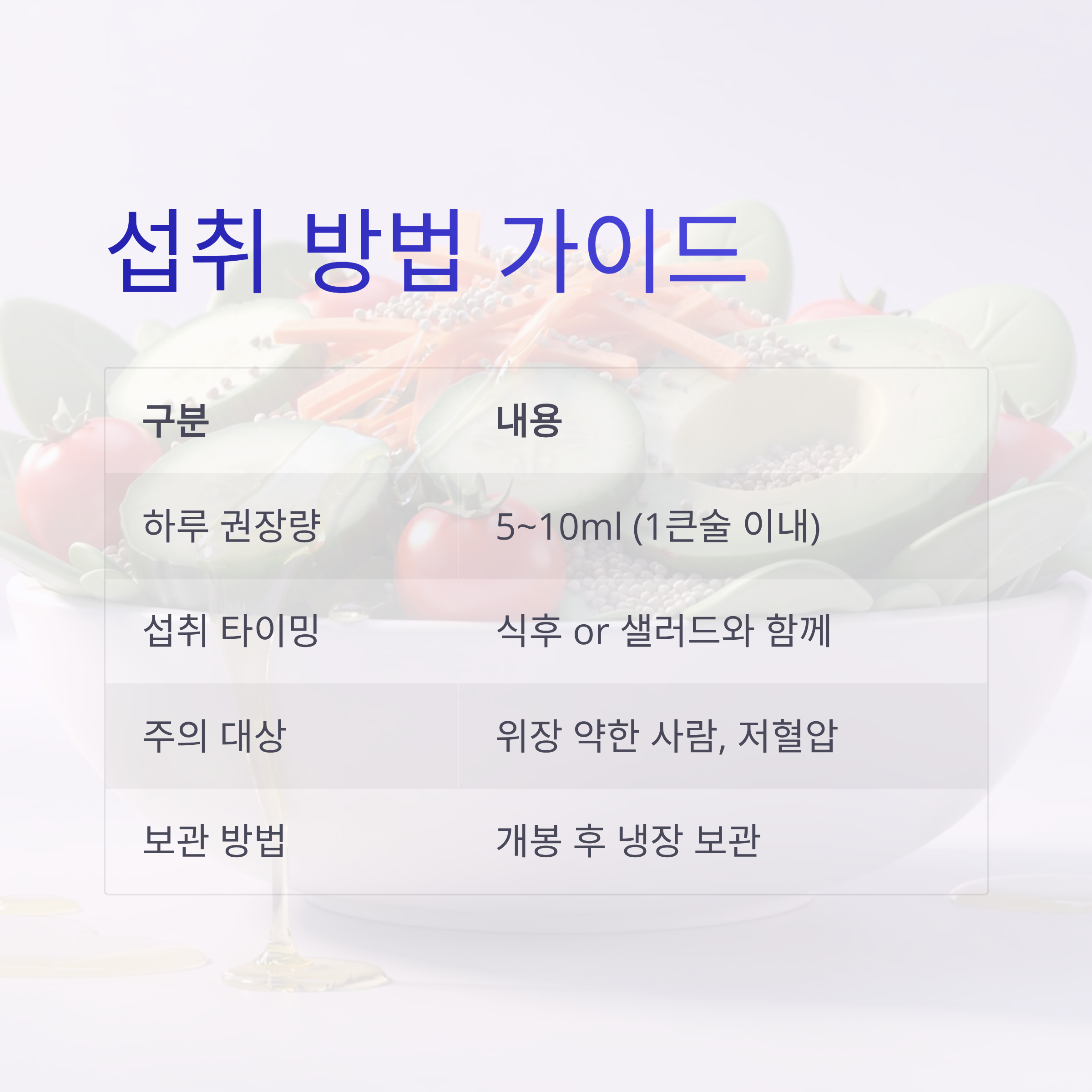 | 섭취 타이밍 | 식후 or 샐러드와 함께 |