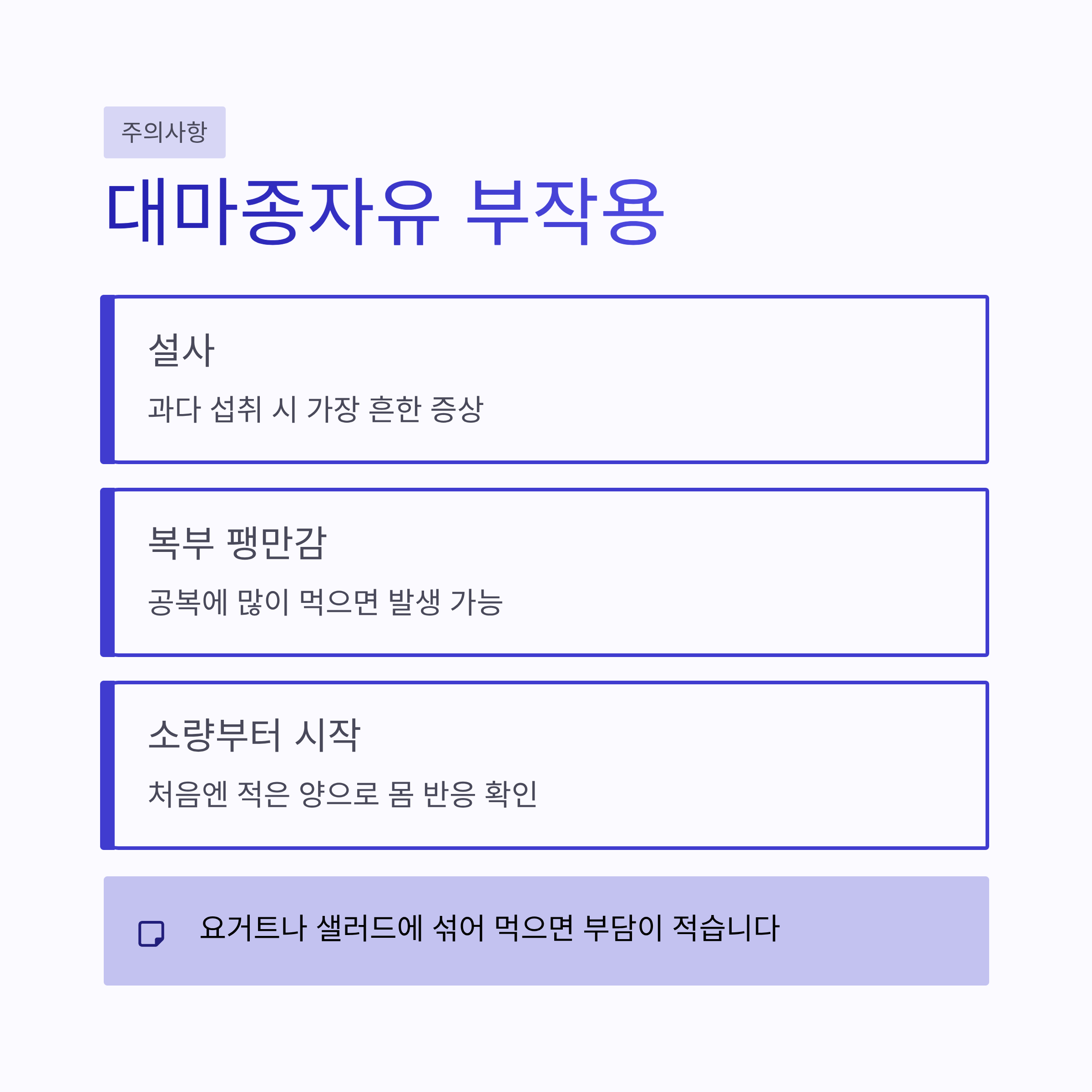 | 주의 대상 | 위장 약한 사람, 저혈압 |