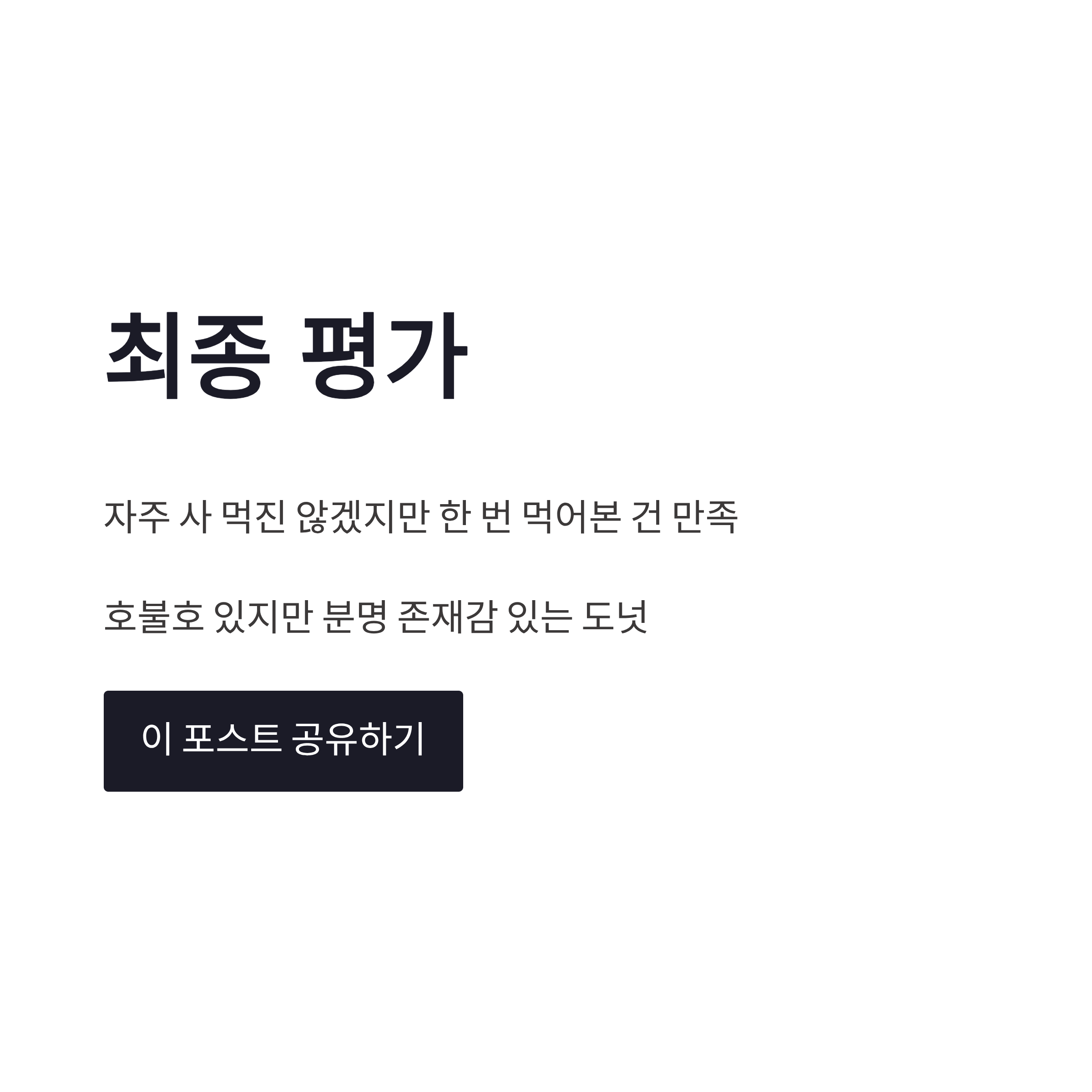 정리해보면 두바이 스타일 초콜릿 도넛은 호불호는 있지만 분명 존재감 있는 도넛이었어요. 달달한 디저트 좋아하고, 새로운 트렌드 한 번쯤 찍먹해보고 싶은 분들에겐 잘 맞을 것 같더라구요. 저는 “자주 사 먹진 않겠지만, 한 번 먹어본 건 만족” 쪽이었습니다 ㅎㅎ 다음에 또 이런 중동 콘셉트 디저트 나오면 괜히 또 궁금해질 것 같네요.