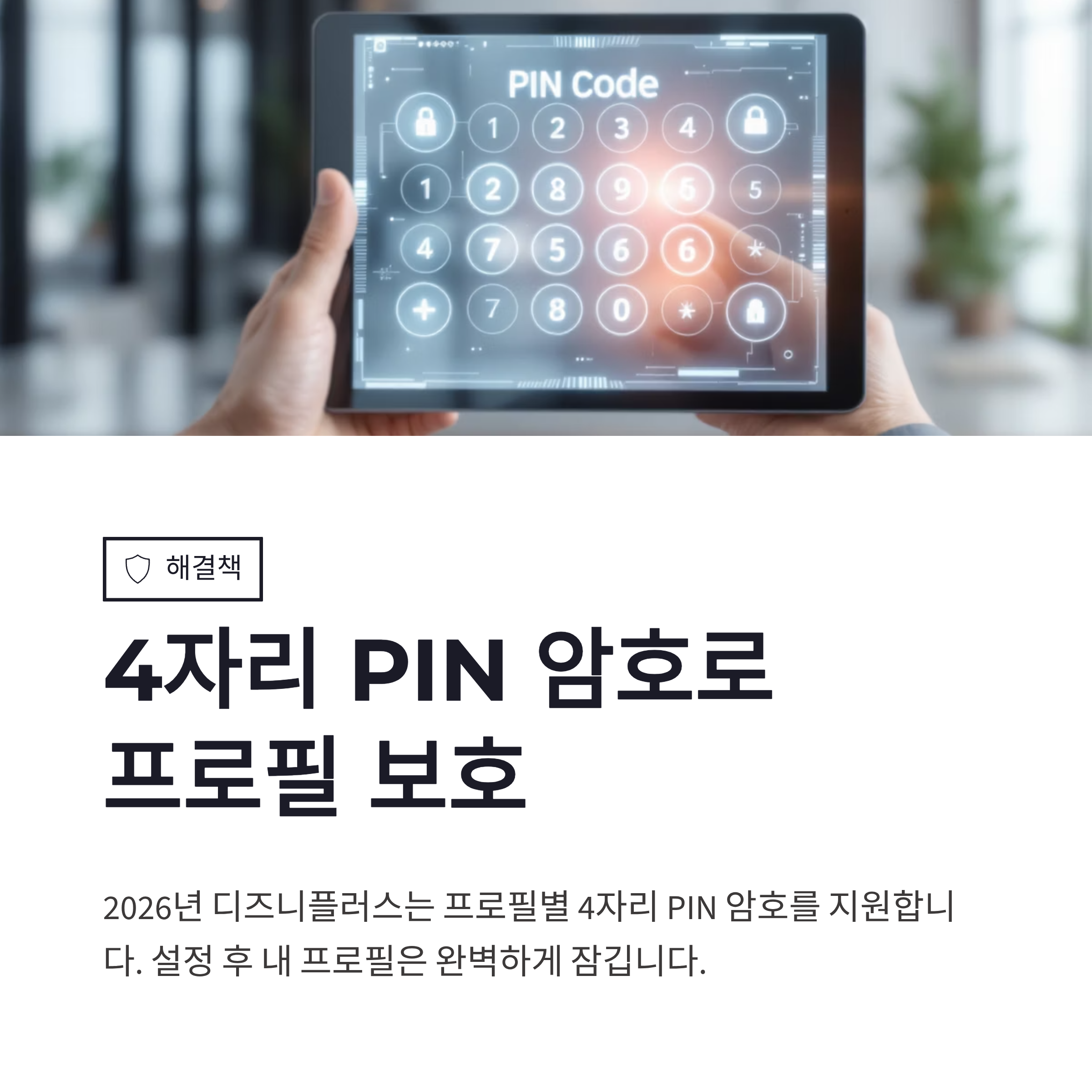 | 단계 | 설정 내용 | 체크 포인트 | | -- | ---------- | ------------ | | 1 | 디즈니플러스 로그인 | 메인 계정 필요 | | 2 | 프로필 선택 | 잠글 프로필 클릭 | | 3 | 프로필 편집 | 연필 아이콘 | | 4 | 프로필 PIN 설정 | 숫자 4자리 입력 | | 5 | 저장 완료 | 재접속 시 PIN 요구 |