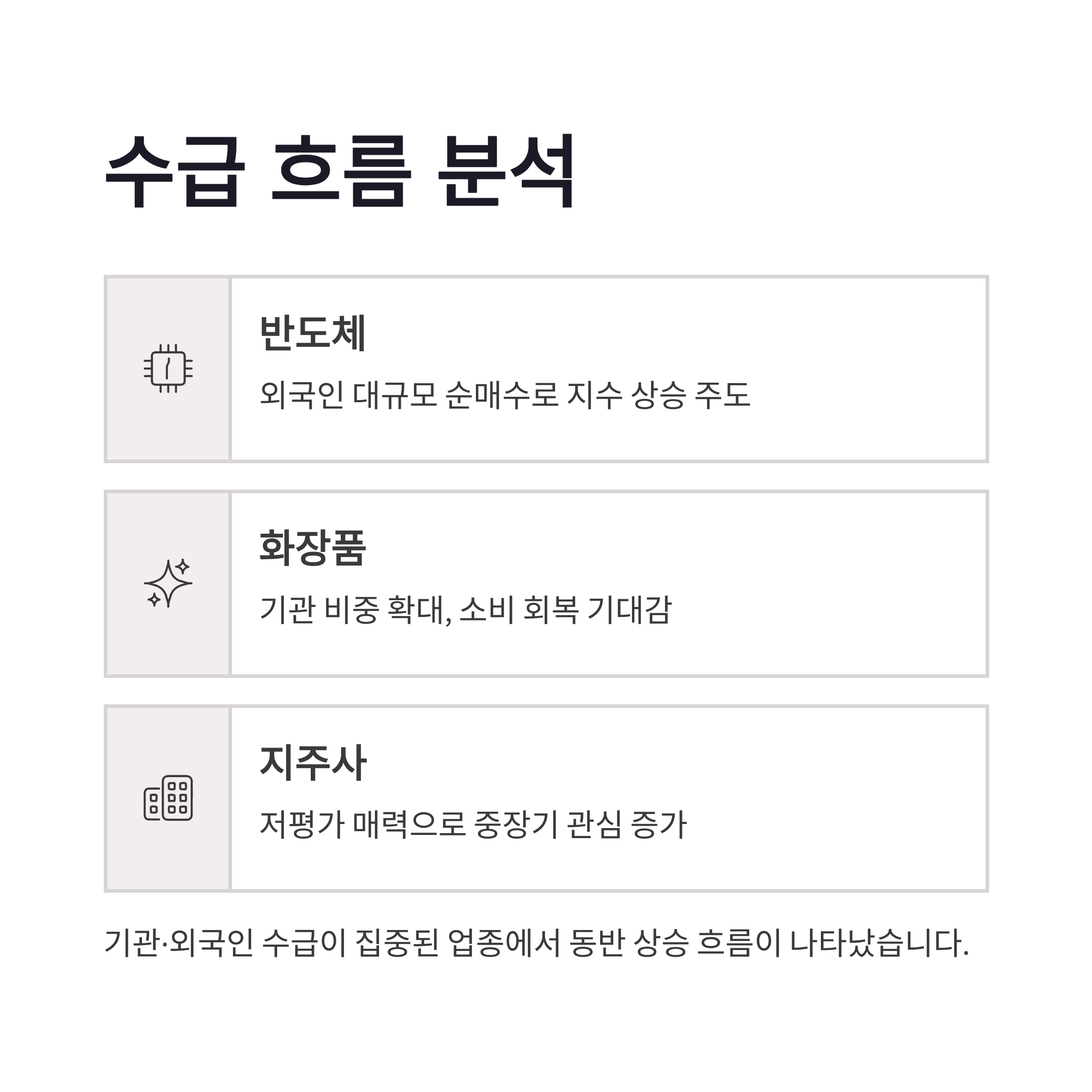 | 반도체 | 외국인 대규모 순매수 | 지수 상승 주도 |