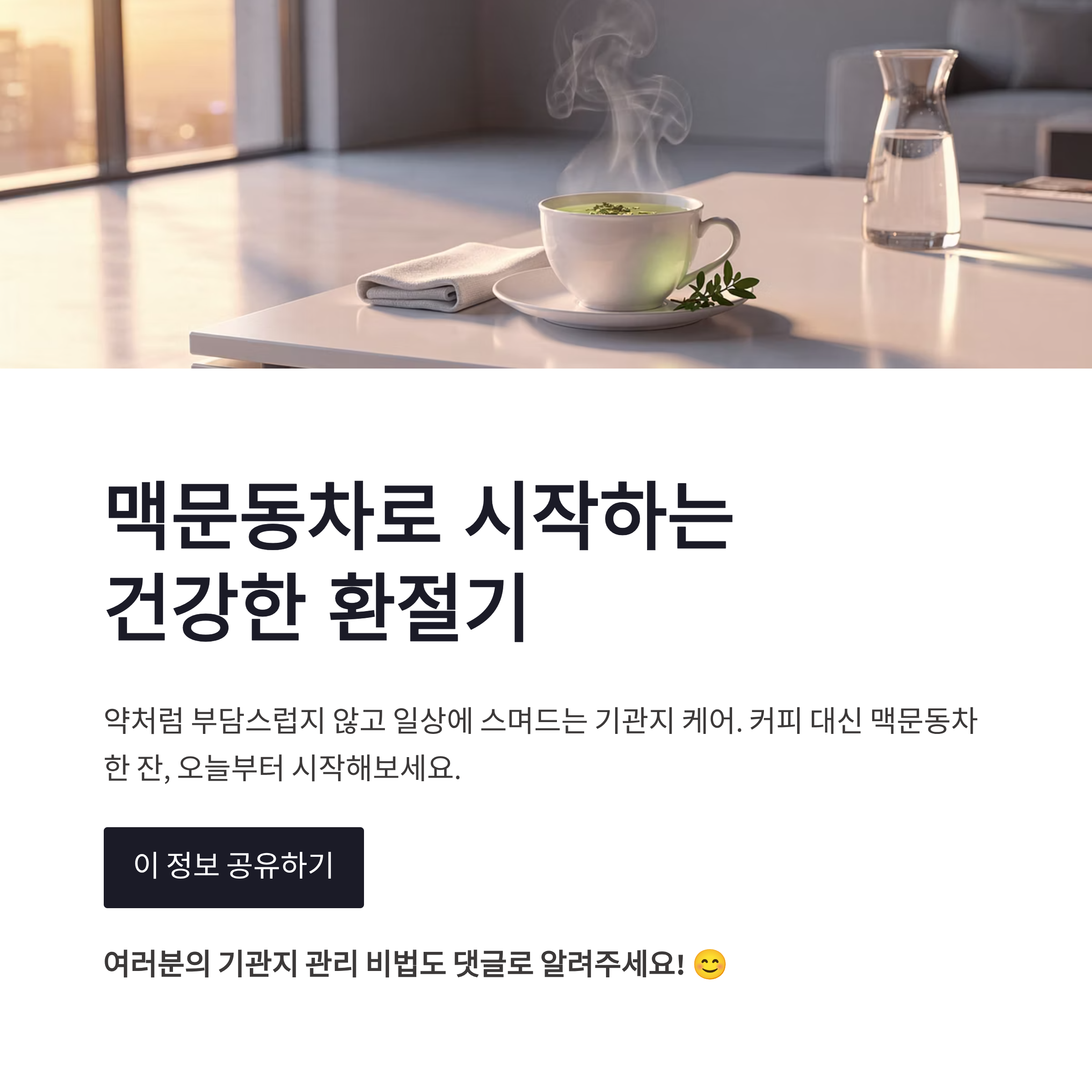 정리해보면 맥문동차는 맛도 부담 없고, 꾸준히 마시기 괜찮은 기관지 케어용 차 느낌이었어요. 약처럼 빡세지 않고 일상에서 스며드는 느낌? 환절기마다 커피 대신 맥문동차 한 잔 챙기는 습관, 생각보다 괜찮더라구요. 여러분은 기관지 관리할 때 어떤 차 드시나요?