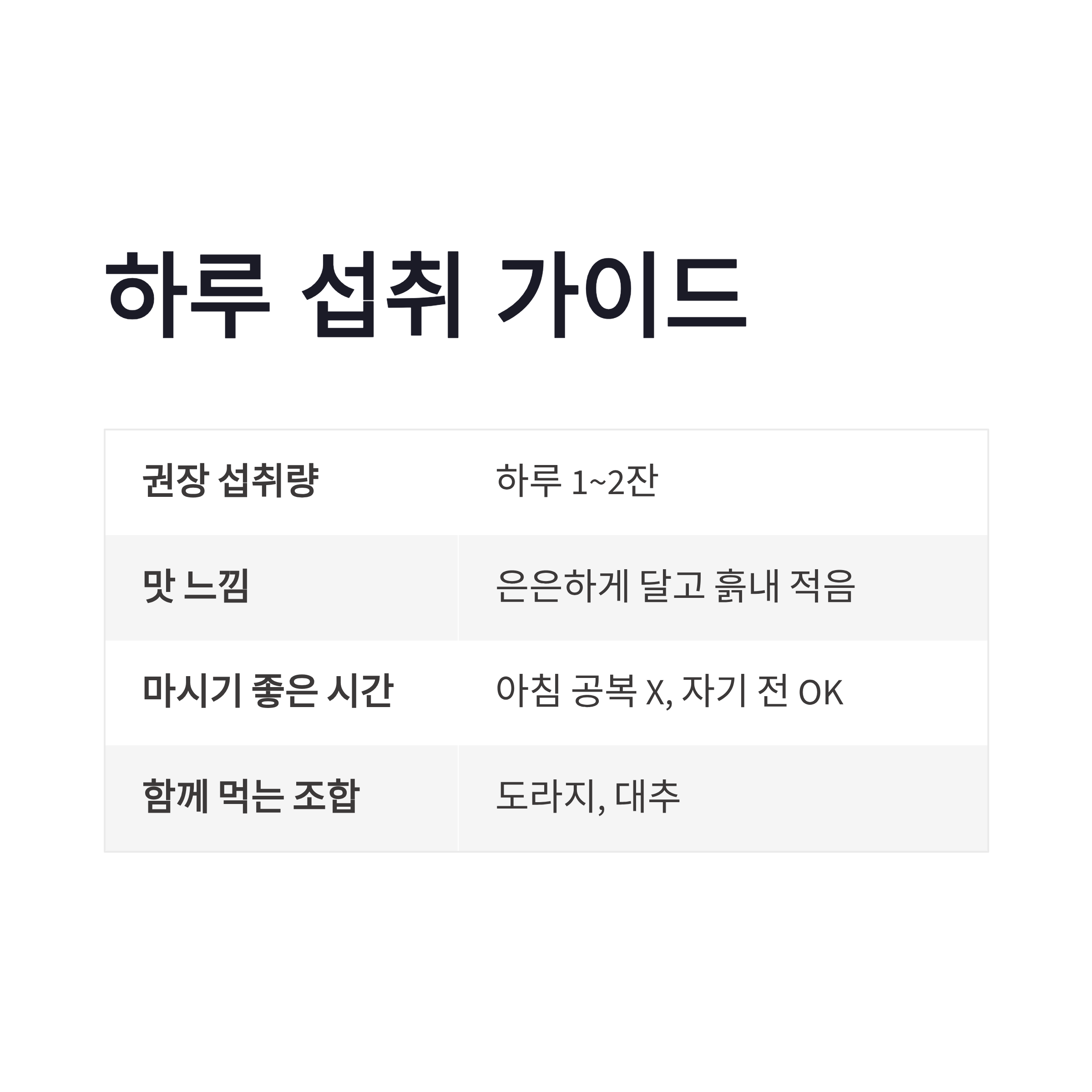 | 마시기 좋은 시간 | 아침 공복 X, 자기 전 OK |