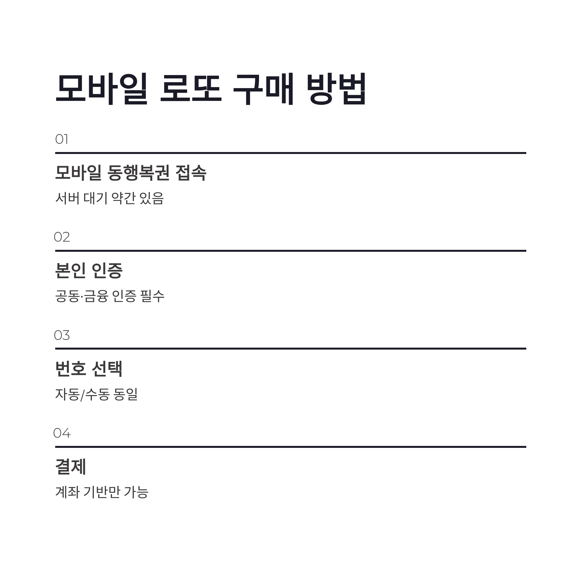 | 단계 | 내용 | 체감 | | -- | ----------- | ------------ | | 1 | 모바일 동행복권 접속 | 서버 대기 약간 있었음 | | 2 | 본인 인증 | 공동·금융 인증 필수 | | 3 | 번호 선택 | 자동/수동 동일 | | 4 | 결제 | 계좌 기반만 가능 |