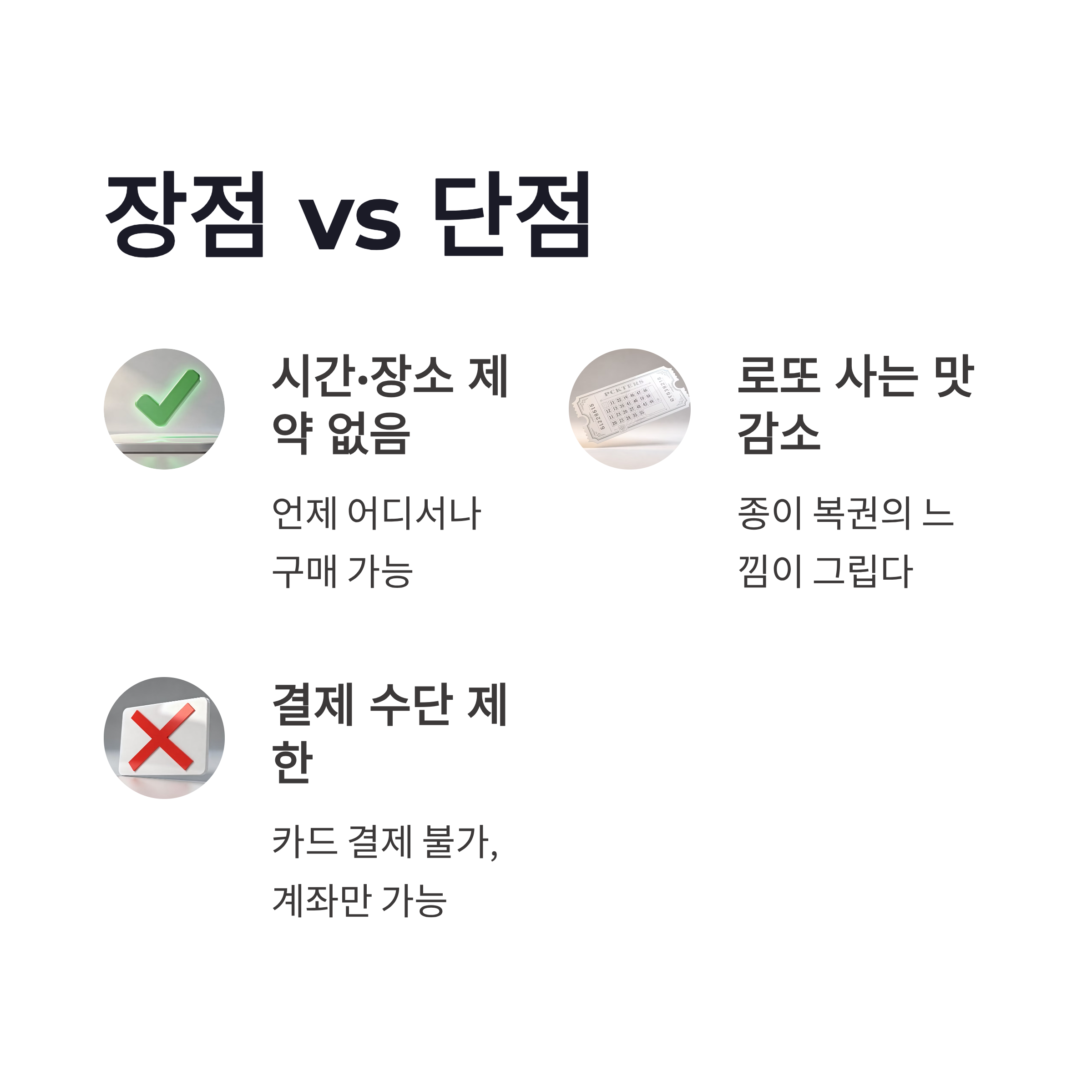 주변 반응도 꽤 갈렸어요. 장점부터 보면, 역시 편의성은 압도적입니다. 시간·장소 제약 없음, 이게 핵심이죠. 반면 단점도 분명 있었어요. “로또 사는 맛이 덜하다”는 의견, 은근 많았습니다. 종이 복권 들고 오는 그 느낌… 저도 인정 ㅠㅠ 그리고 2026년 기준으로도 결제 수단이 제한적이라는 점은 아쉬웠어요. 카드 결제 안 되는 거, 생각보다 불편하더라구요.