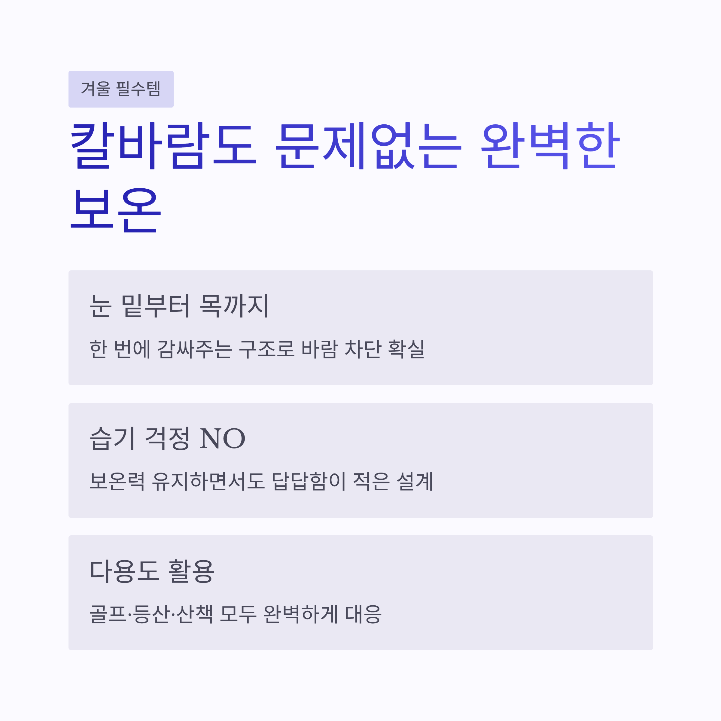 | 보온력 | 영하권에서도 얼굴 시림 거의 없음 |