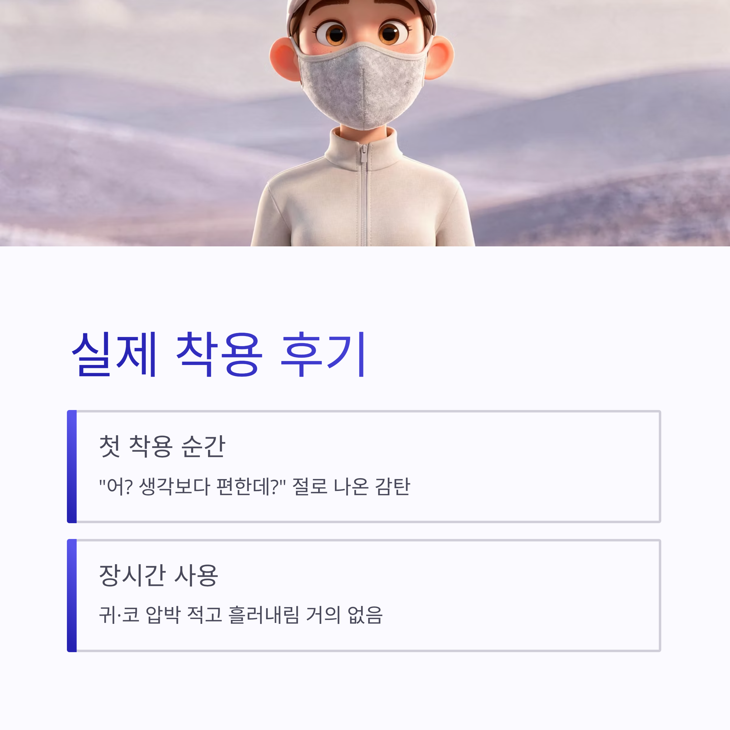 | 착용감 | 귀·코 압박 적고 장시간 착용 가능 |