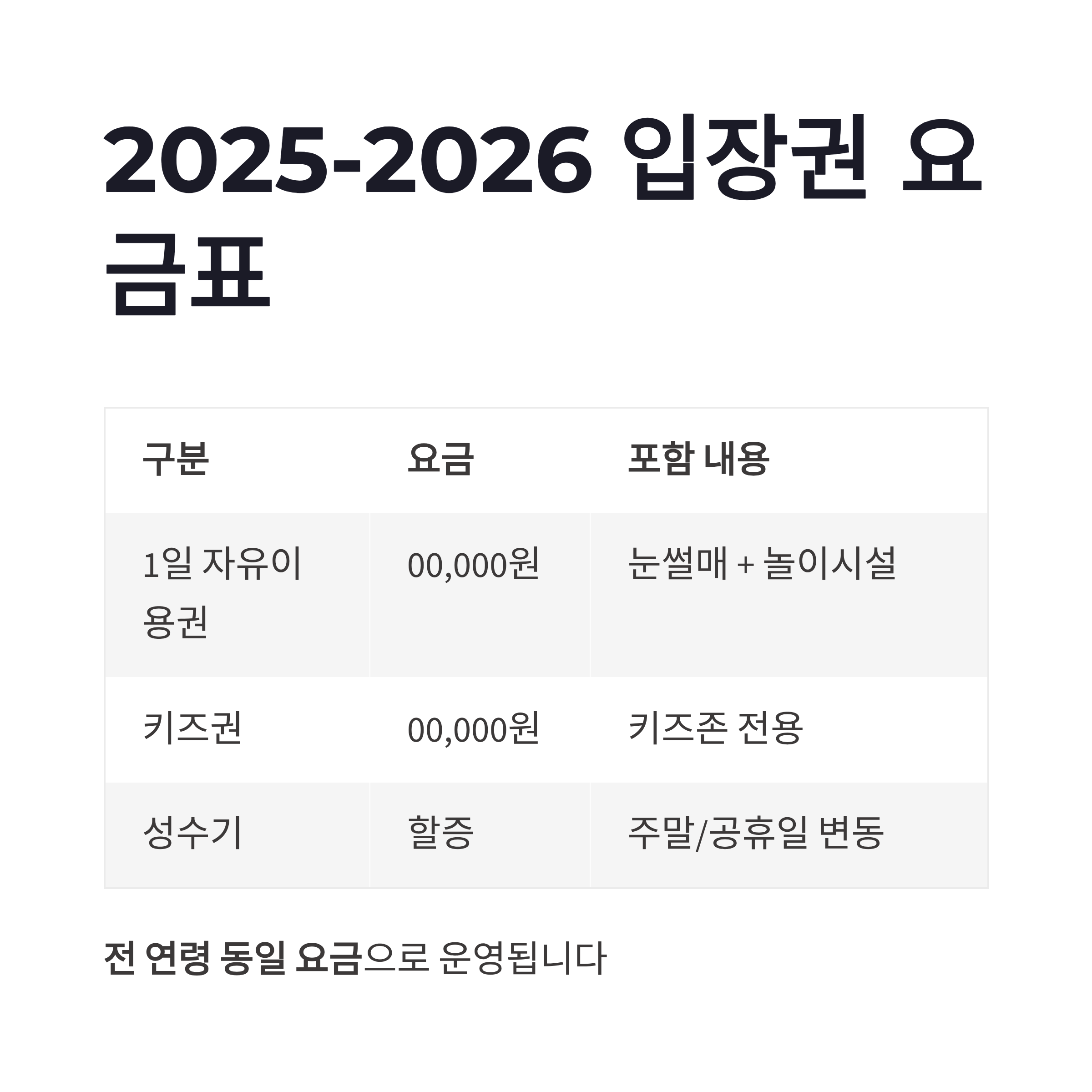 | 1일 자유이용권 | 00,000원 | 눈썰매 + 일부 놀이시설 포함 | 전 연령 동일 |