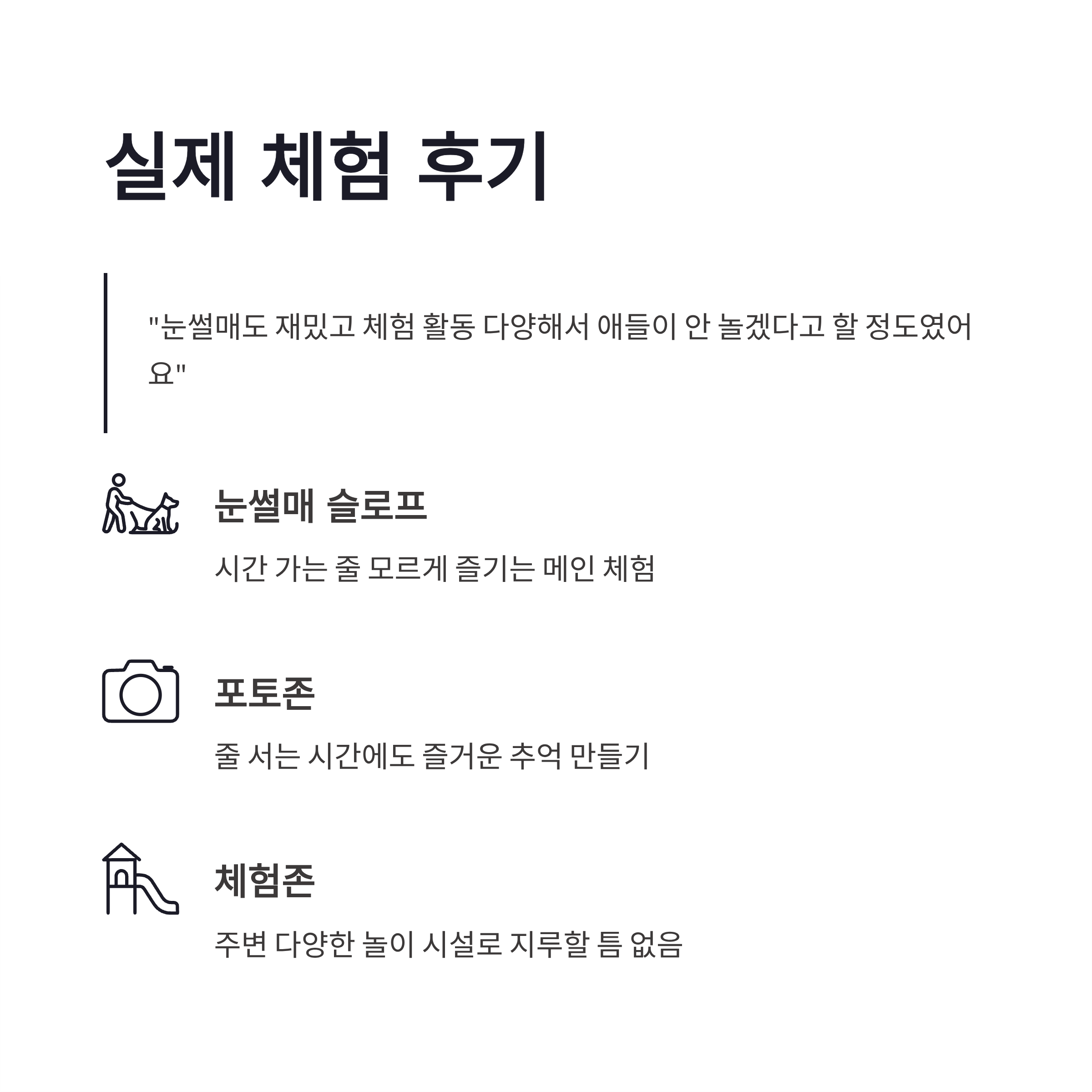 나는 주말 가족 나들이로 비발디파크 스노위랜드 다녀왔는데요, 솔직히 눈썰매도 재밌고 그 주변 체험 활동들도 다양해서 애들이 거의 안 놀겠다고 할 정도였어요ㅠㅠ 특히 눈썰매 줄 서는 시간이 길어질 땐 주변 포토존이나 간단한 체험존이 있어서 시간 보내기 좋더라구요! 하지만 인기 많은만큼 주말/성수기는 붐비는 점이 살짝 아쉬웠어요. 그래서 평일로 갈 수 있으면 훨씬 여유롭게 즐길 수 있겠쥬? 그리고 따뜻한 옷 + 여벌 신발 필수입니다! 눈이랑 물 튀어서 진짜.. ㅎㅎ