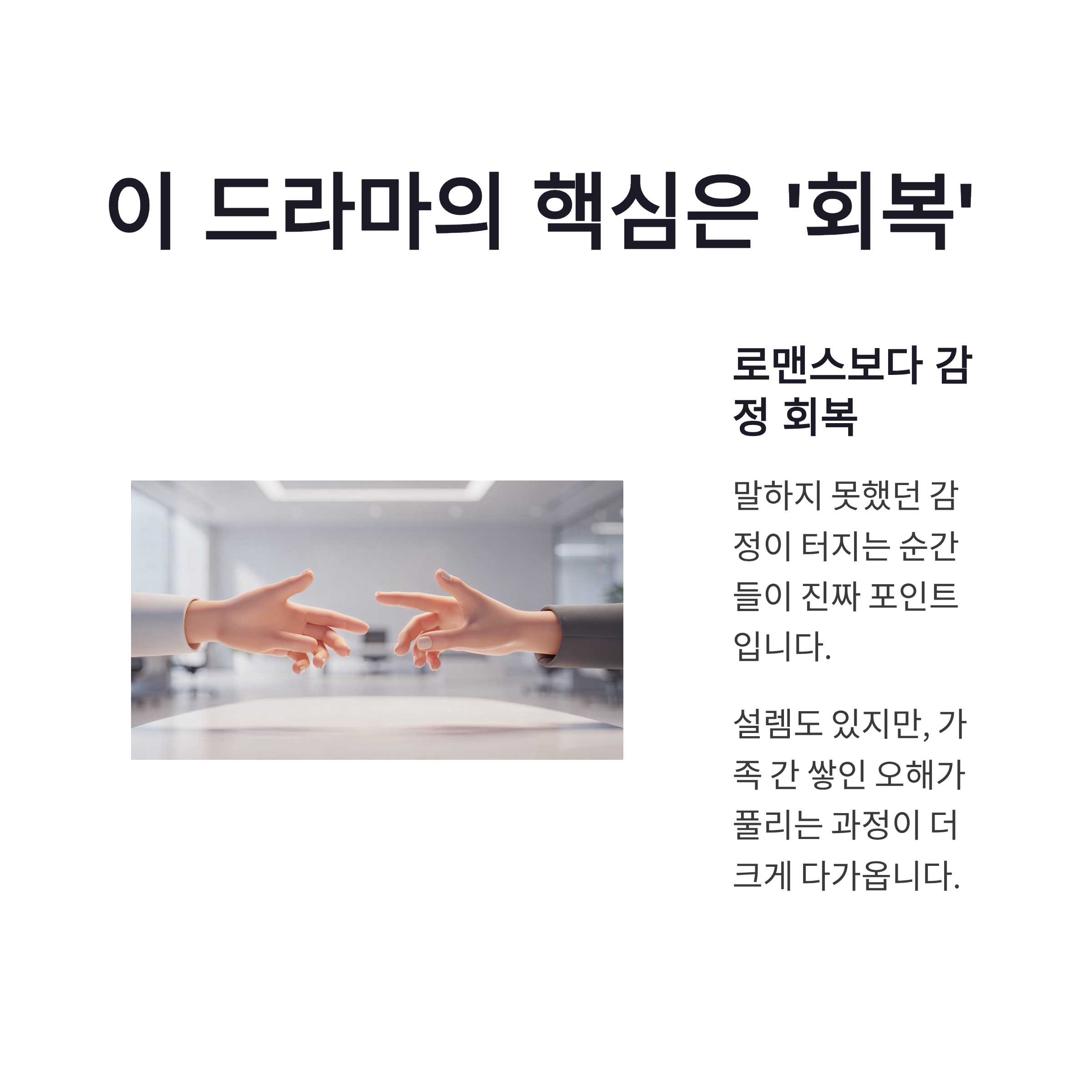사랑을처방해드립니다가 재밌는 이유는 로맨스보다도 ‘회복’에 초점이 있다는 점 같아요. 물론 설렘 포인트도 있지만, 그보다 말하지 못했던 감정이 터지는 순간들이 더 크게 다가옵니다. 장점은 감정선이 과하지 않다는 거, 단점이라면 초반이 살짝 잔잔해서 답답하게 느껴질 수도 있다는 점? 그래도 이건 주말드라마 감성이라 이해됨다. ㅋㅋ 앞으로 사랑을처방해드립니다 전개는 두 집안의 과거 사건이 하나씩 드러나면서, 관계가 어떻게 바뀌는지가 핵심이 될 것 같아요. 개인적으로는 중반부 가족 화해 장면에서 눈물 버튼 제대로 올 듯한 예감이… 벌써부터 살짝 긴장됨다.