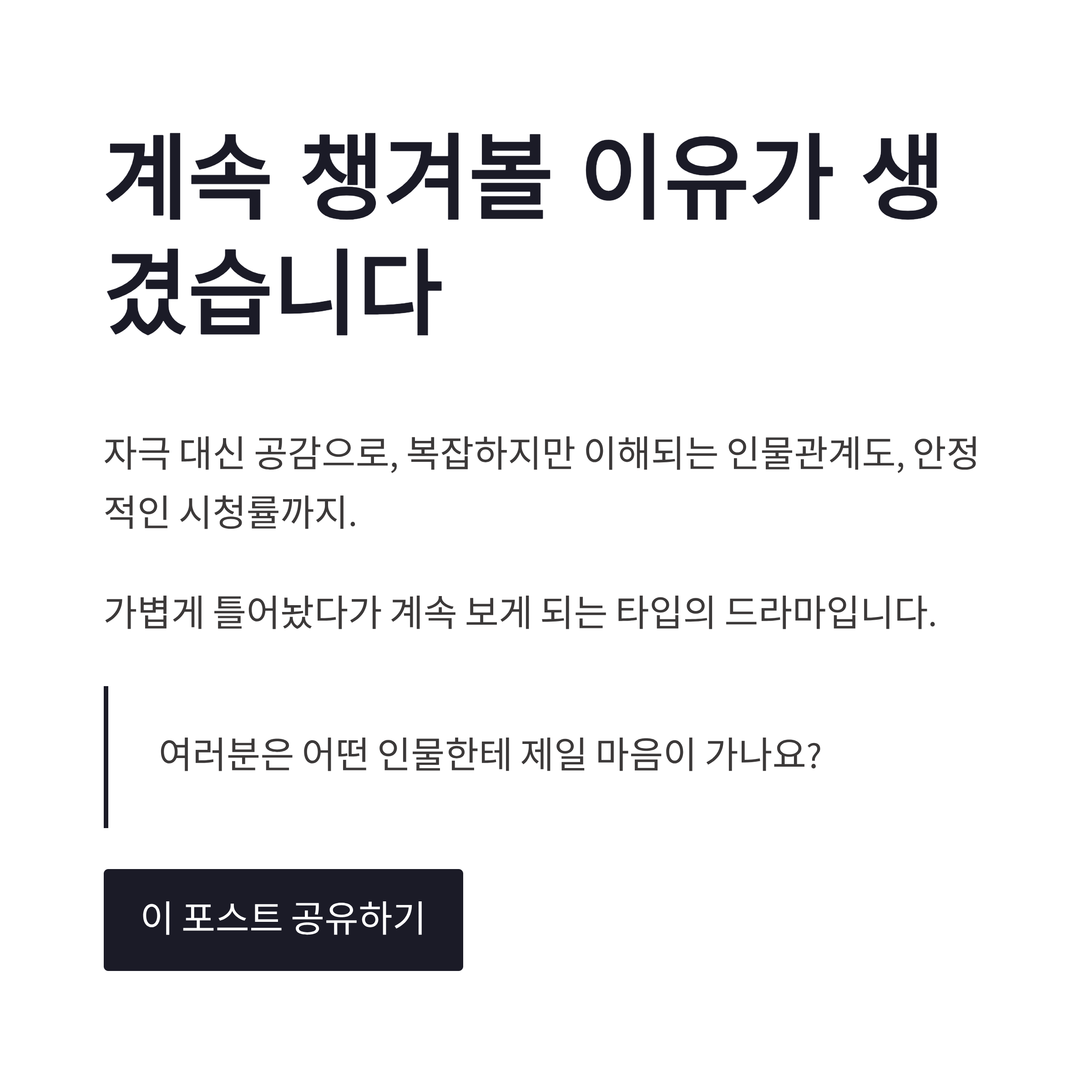 정리해보면 사랑을처방해드립니다는 자극 대신 공감으로 승부하는 드라마였구요. 인물관계도는 복잡하지만 이해하기 어렵지 않고, 시청률도 주말극답게 안정적입니다. 가볍게 틀어놨다가 계속 보게 되는 타입이라서, 가족이랑 같이 볼 드라마 찾는 분들께 딱이더라구요. 앞으로 사랑을처방해드립니다가 어떤 화해의 결말을 보여줄지, 저도 계속 챙겨볼 생각입니다. 여러분은 이 드라마 보면서 어떤 인물한테 제일 마음 가던가요? ㅎㅎ