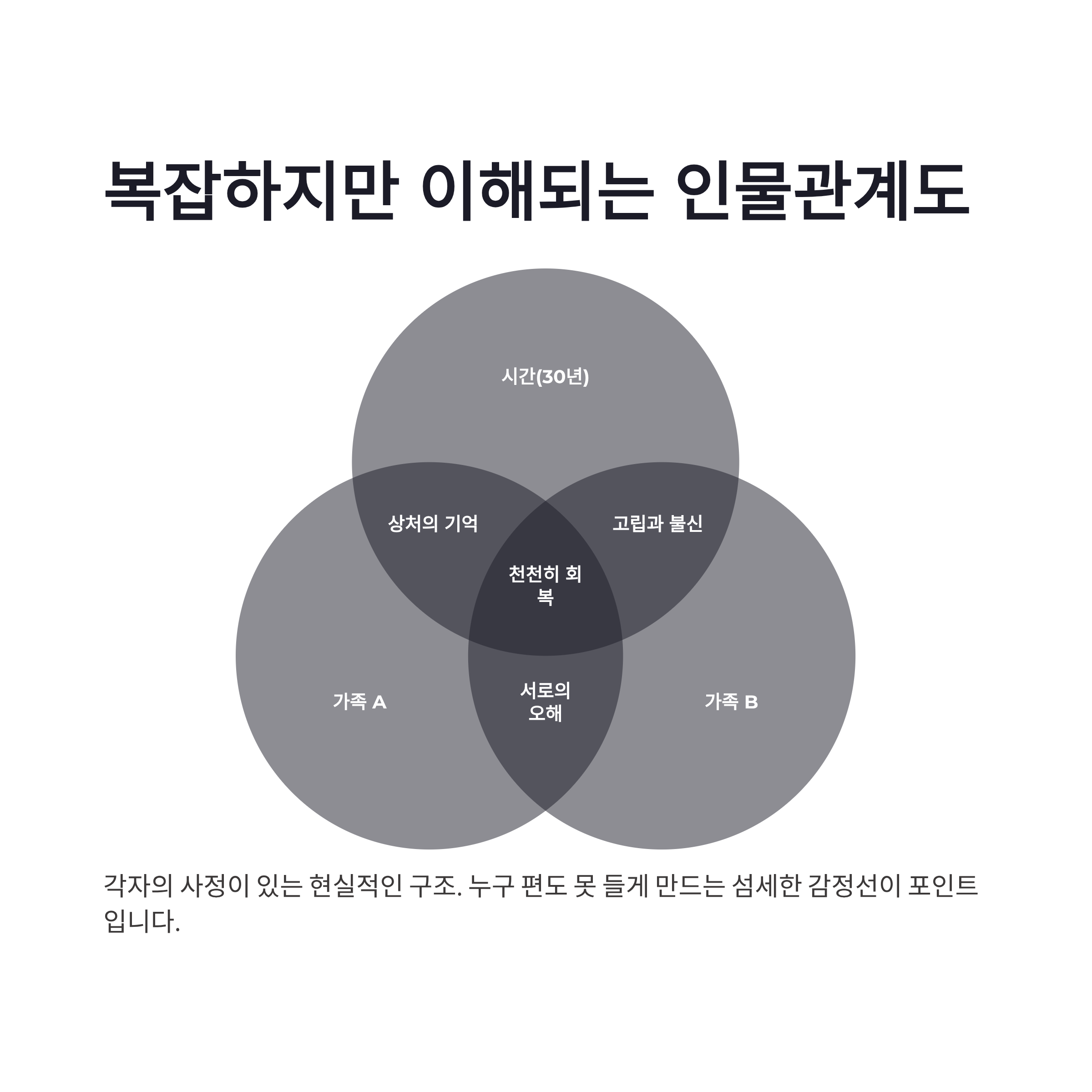 처음 사랑을처방해드립니다 방송 보고 나서 든 생각이요. “아… 이거 주말마다 보게 되겠는데?”였슴다. ㅎㅎ 요즘 자극적인 전개 많은데, 이 드라마는 시작부터 결이 좀 달랐어요. 사랑을처방해드립니다는 30년 동안 엉켜 있던 두 집안의 악연을 중심으로, 오해가 풀리고 관계가 천천히 회복되는 과정을 보여주는데요. 인물관계도만 봐도 복잡하긴 한데, 막상 보다 보면 흐름이 자연스럽게 이해됩니다. 특히 가족 간 말 한마디, 표정 하나에서 쌓여온 감정이 느껴져서 괜히 몰입하게 되더라구요. 저도 보면서 “이건 누구 편도 못 들겠다…” 이런 생각 여러 번 들었슴다. 사랑을처방해드립니다 인물관계도는 단순 갈등 구도가 아니라, 각자 사정이 다 있는 구조라서 더 현실적으로 느껴졌어요.