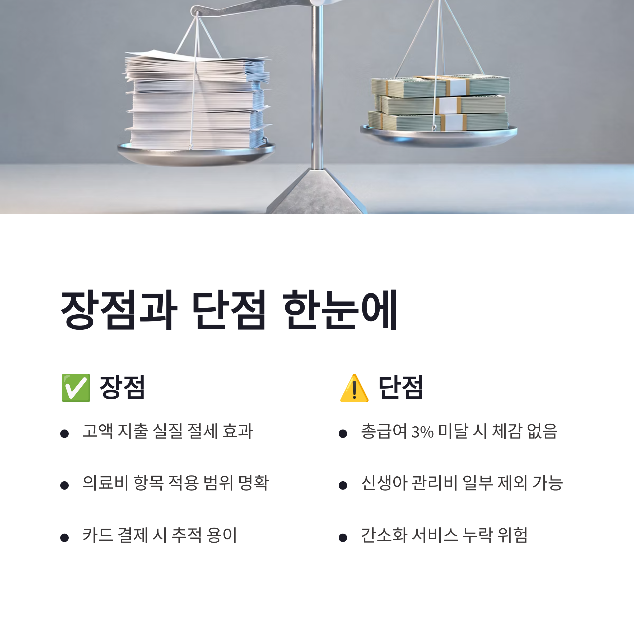 * 고액 지출에 대한 실질 절세 효과 * 의료비 항목이라 적용 범위가 비교적 명확 * 카드 결제 시 추적이 쉬움