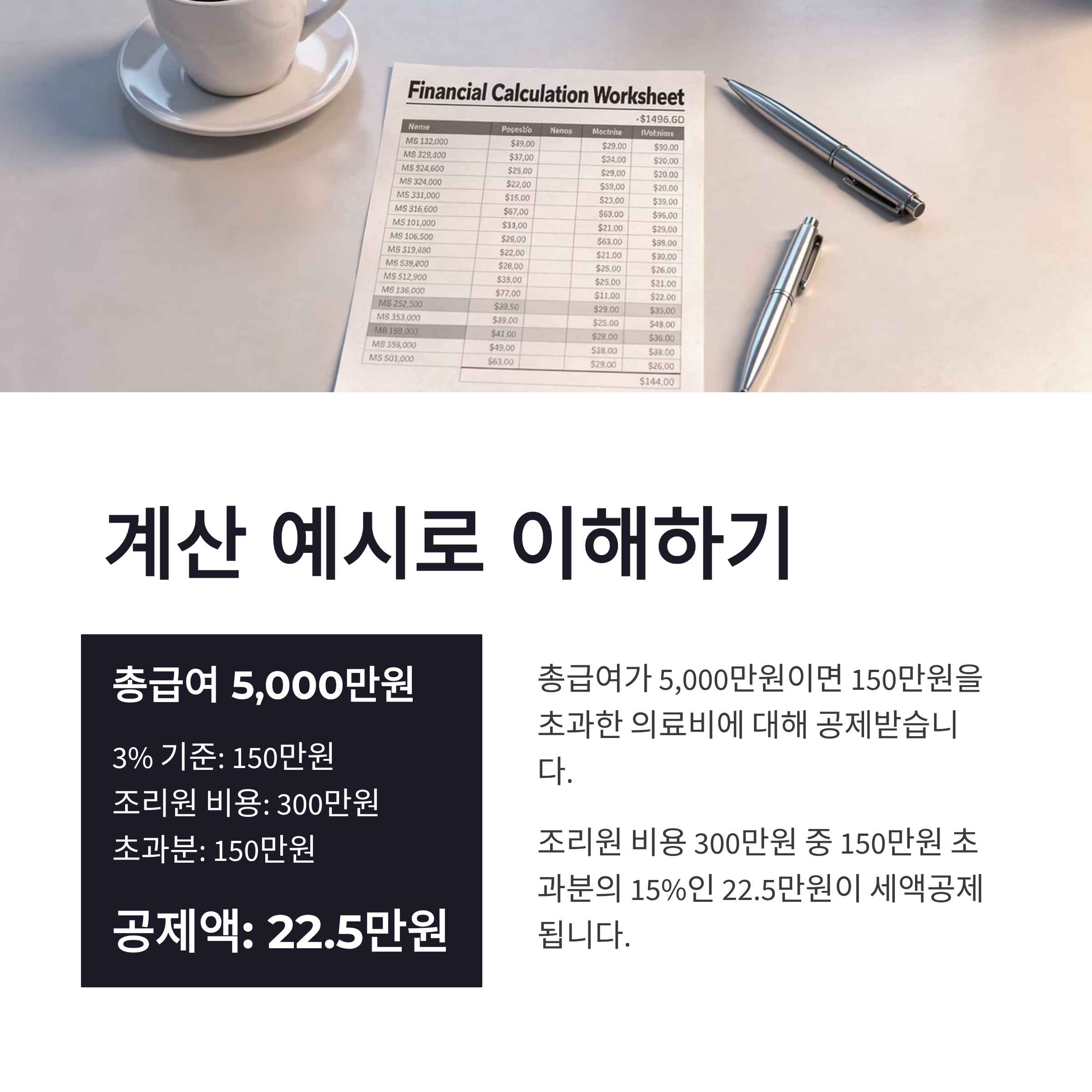 예를 들어 총급여가 5,000만원이면 150만원(3%)을 초과한 의료비에 대해 15% 공제입니다.