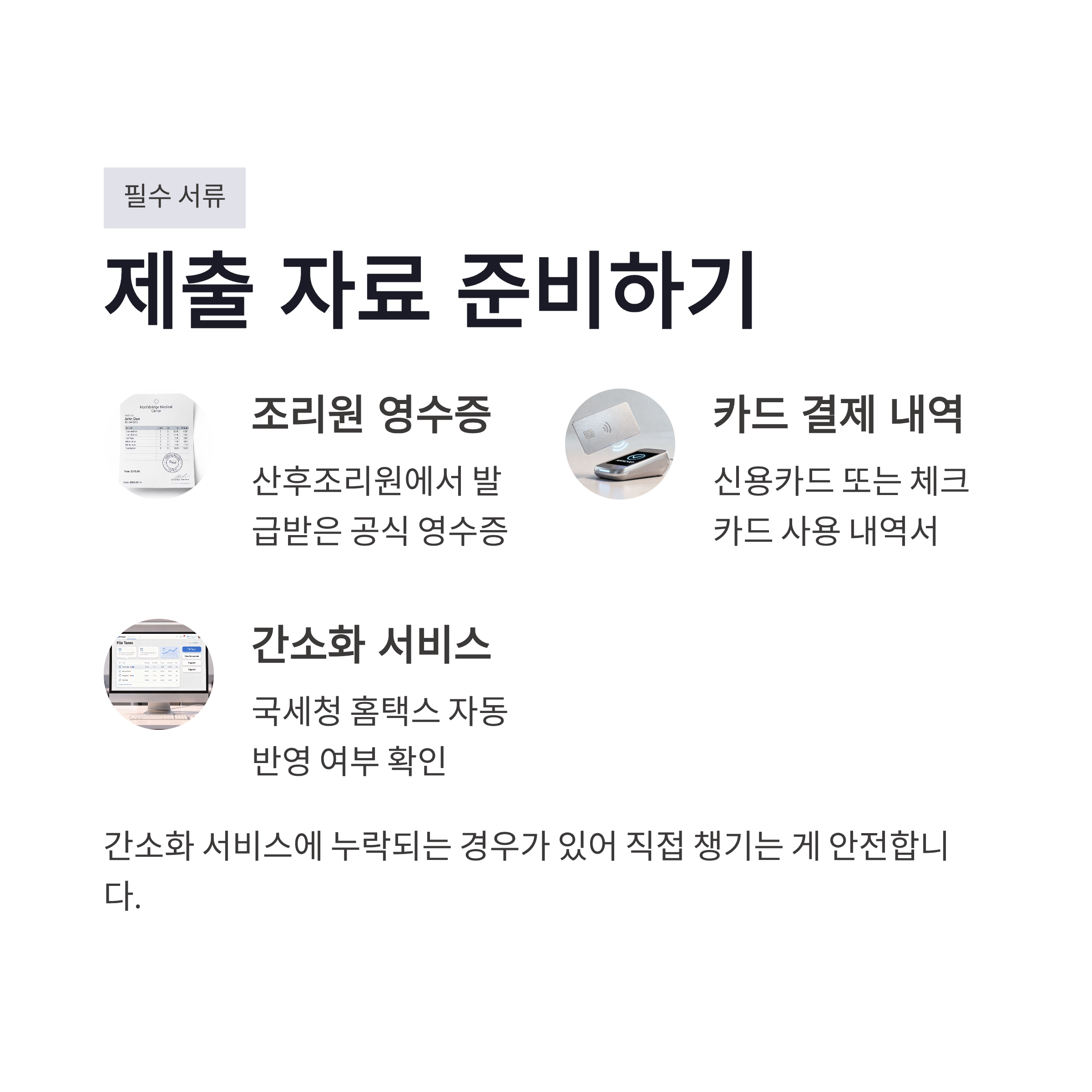 | 제출 자료 | 조리원 영수증, 카드내역 | 간소화 서비스 확인 |