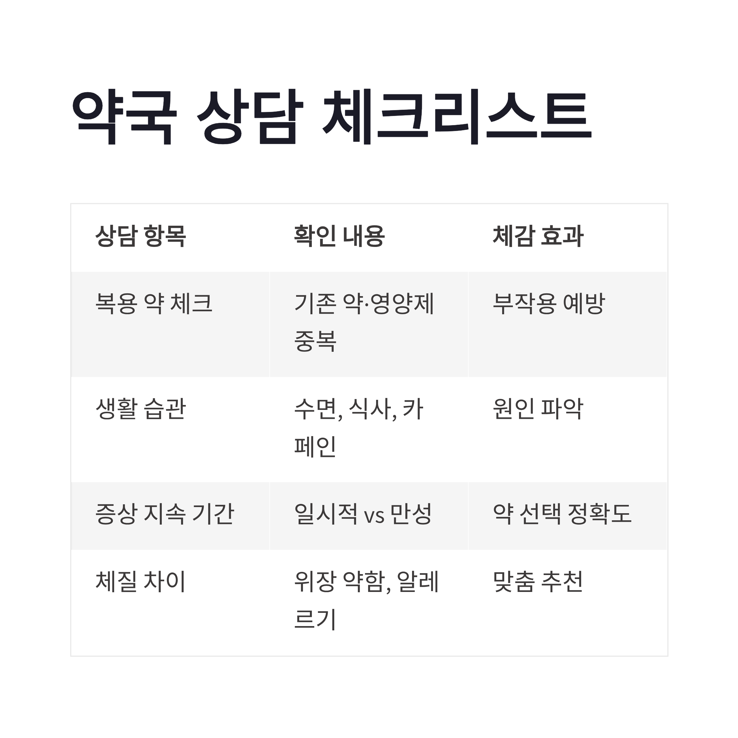 사실 같은 두통, 같은 피로여도 사람마다 원인이 다르잖아요. 그래서 생활의달인 약사달인 윤유현 약사가 강조한 게 바로 ‘맞춤 상담’이더라구요. 약국에서 짧게라도 요즘 잠은 잘 자는지, 스트레스는 어떤지 이런 걸 물어보는 이유가 다 있었던 거죠. 제가 정리해본 약국 상담 포인트를 표로 보면 이렇습니다.