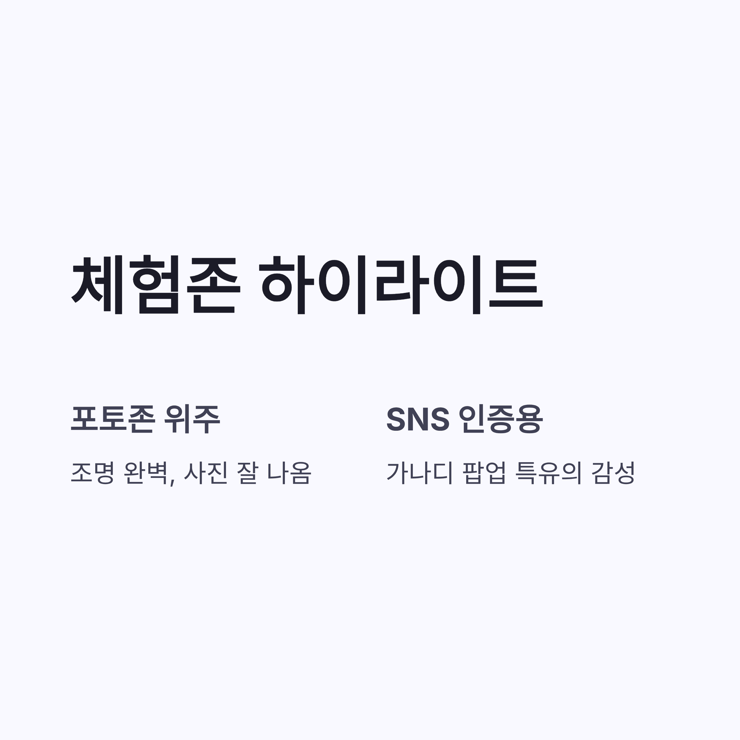 체험존은 포토존 위주인데, 조명이 잘 잡혀서 사진은 진짜 잘 나와요. 가나디 팝업답게 SNS 인증용으로 딱이더라구요.