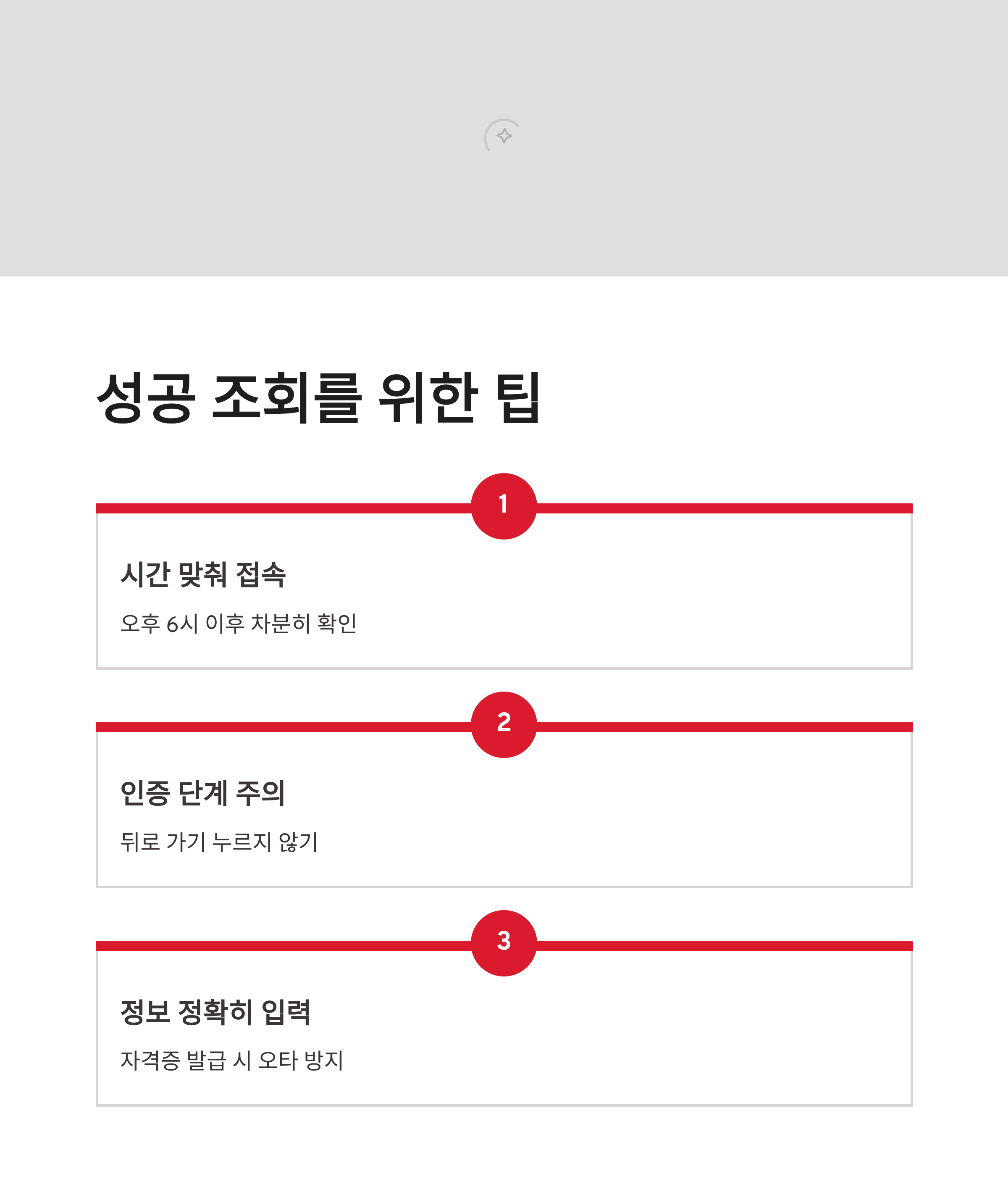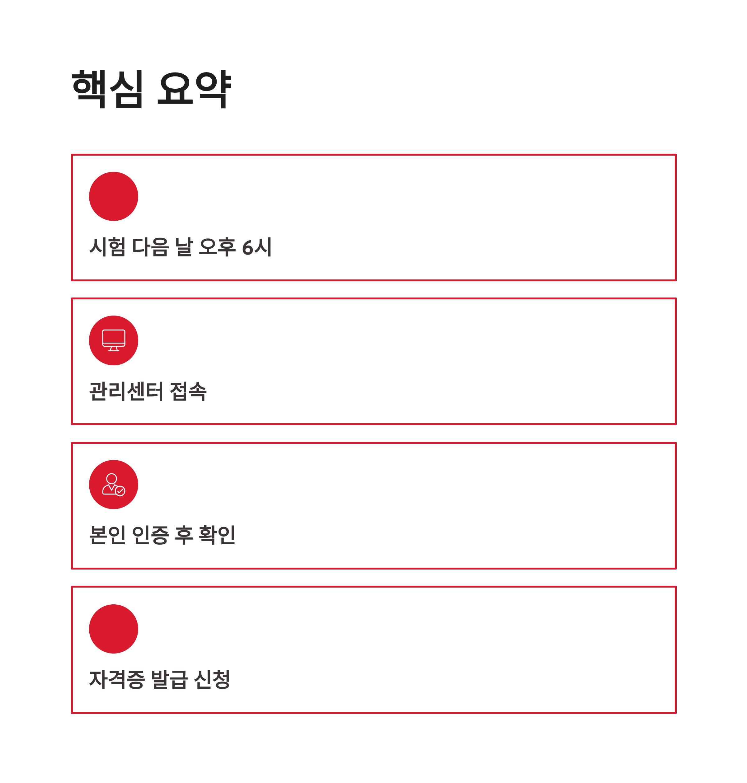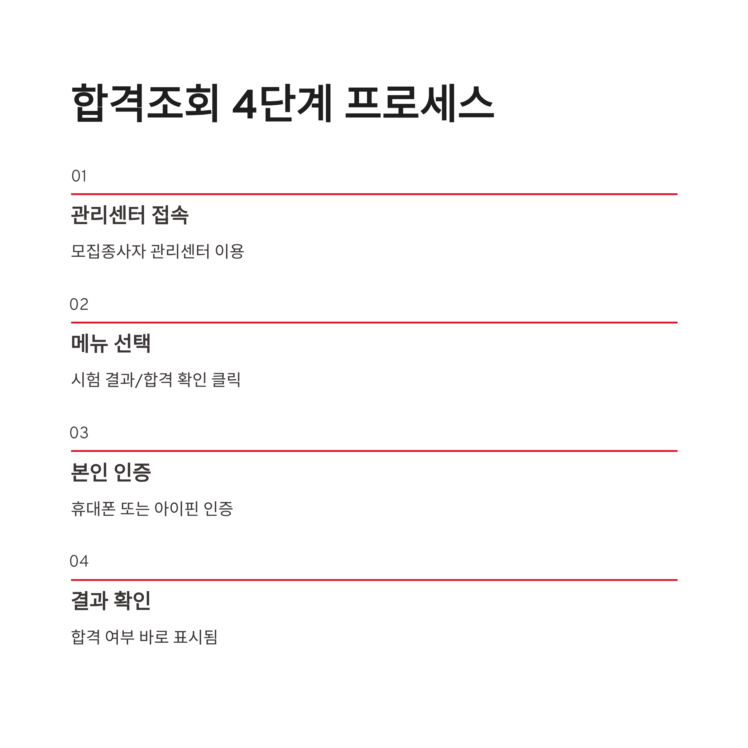 | 단계 | 내용 | 체크 포인트 | | -- | ----------- | ------------- | | 1 | 관리센터 접속 | 모집종사자 관리센터 이용 | | 2 | 결과 조회 메뉴 선택 | 시험 결과/합격 확인 | | 3 | 본인 인증 | 휴대폰 또는 아이핀 | | 4 | 결과 확인 | 합격 여부 바로 표시 |