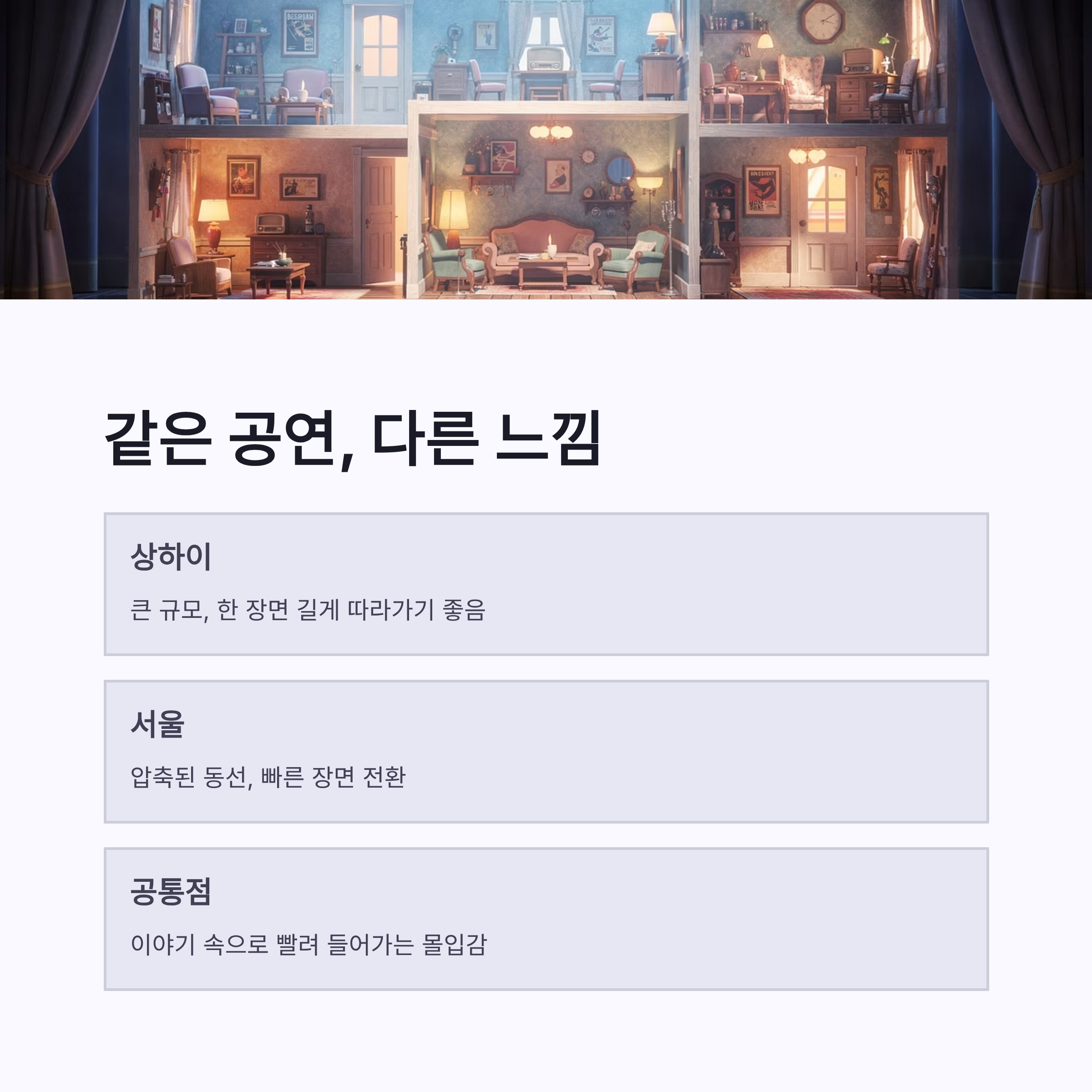 슬립노모어를 처음 봤을 때도 충격이었는데요, 상하이랑 서울에서 각각 보고 나니 느낌이 완전 다르더라구요. 같은 슬립노모어인데도 공간 크기, 관객 흐름, 배우 밀도 때문에 체감이 달라요. 상하이는 규모가 커서 한 장면을 길게 따라가기 좋고, 서울은 압축된 동선 덕분에 장면 전환이 빠르다는 인상이었어요. 처음엔 “이게 뭐지?” 싶다가도 어느 순간 이야기 안으로 빨려 들어가는데, 이게 슬립노모어의 묘미더라구요. 이머시브 공연 특성상 준비 정도에 따라 만족도가 확 갈려요. 저는 상하이에서는 여유, 서울에서는 집중력이 더 중요하다고 느꼈습니다 ㅎㅎ
