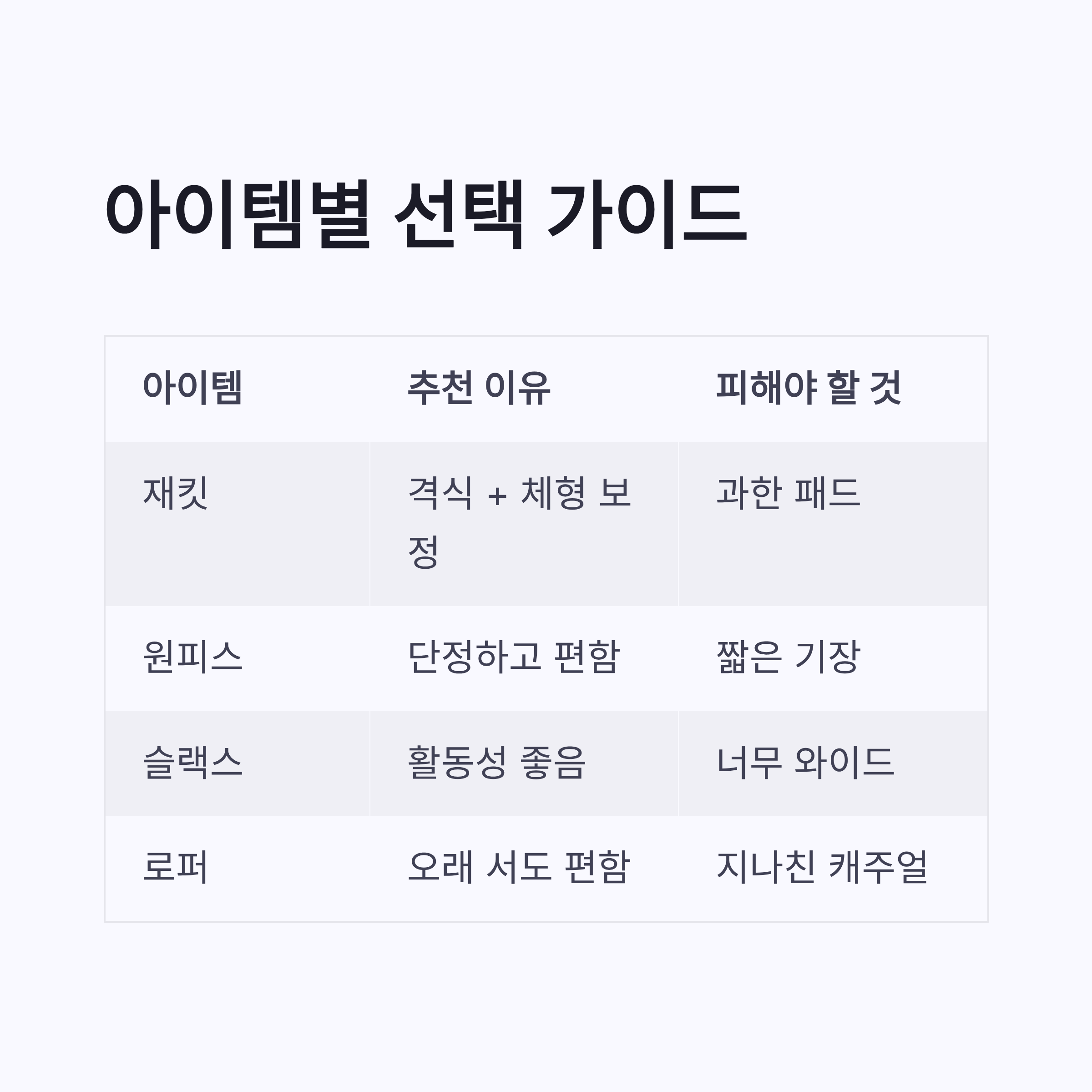| 아이템 | 추천 이유 | 피해야 할 포인트 |