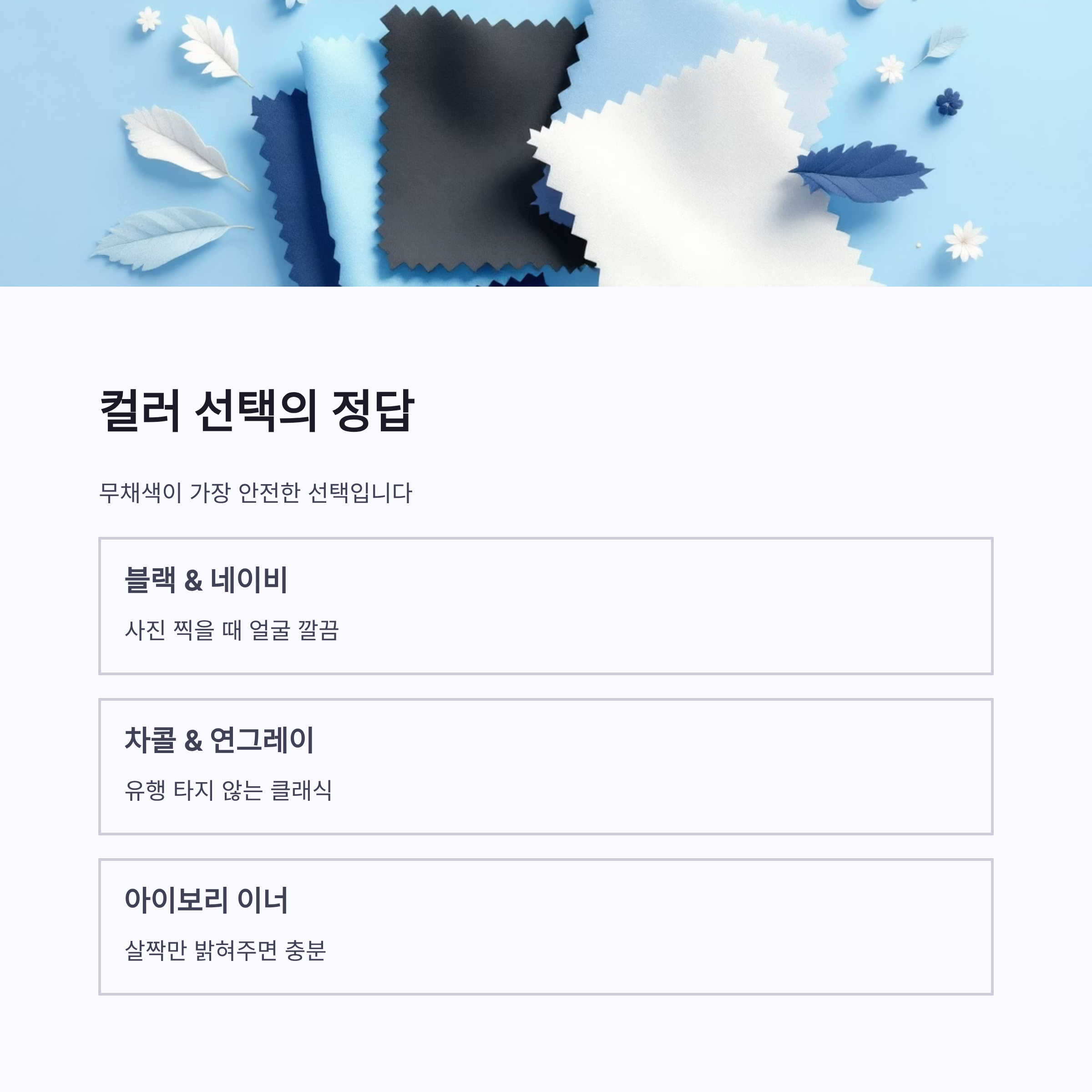 졸업식에서는 컬러가 반 이상 먹고 들어갑니다. 학부모 졸업식 패션에서 가장 안전한 답은 역시 무채색이에요. 블랙, 네이비, 차콜, 연그레이 이런 톤이요. 사진 찍을 때 얼굴도 깔끔해 보이고, 유행도 덜 타서 좋더라구요. 저는 예전에 밝은 베이지 코트 입었다가 단체사진에서 혼자 튀어 보여서 살짝 민망…ㅎㅎ 그 뒤로는 무채색이 진짜 정답이구나 싶었어요. 이너는 아이보리나 연한 블라우스로 살짝만 밝히면 충분합니다.