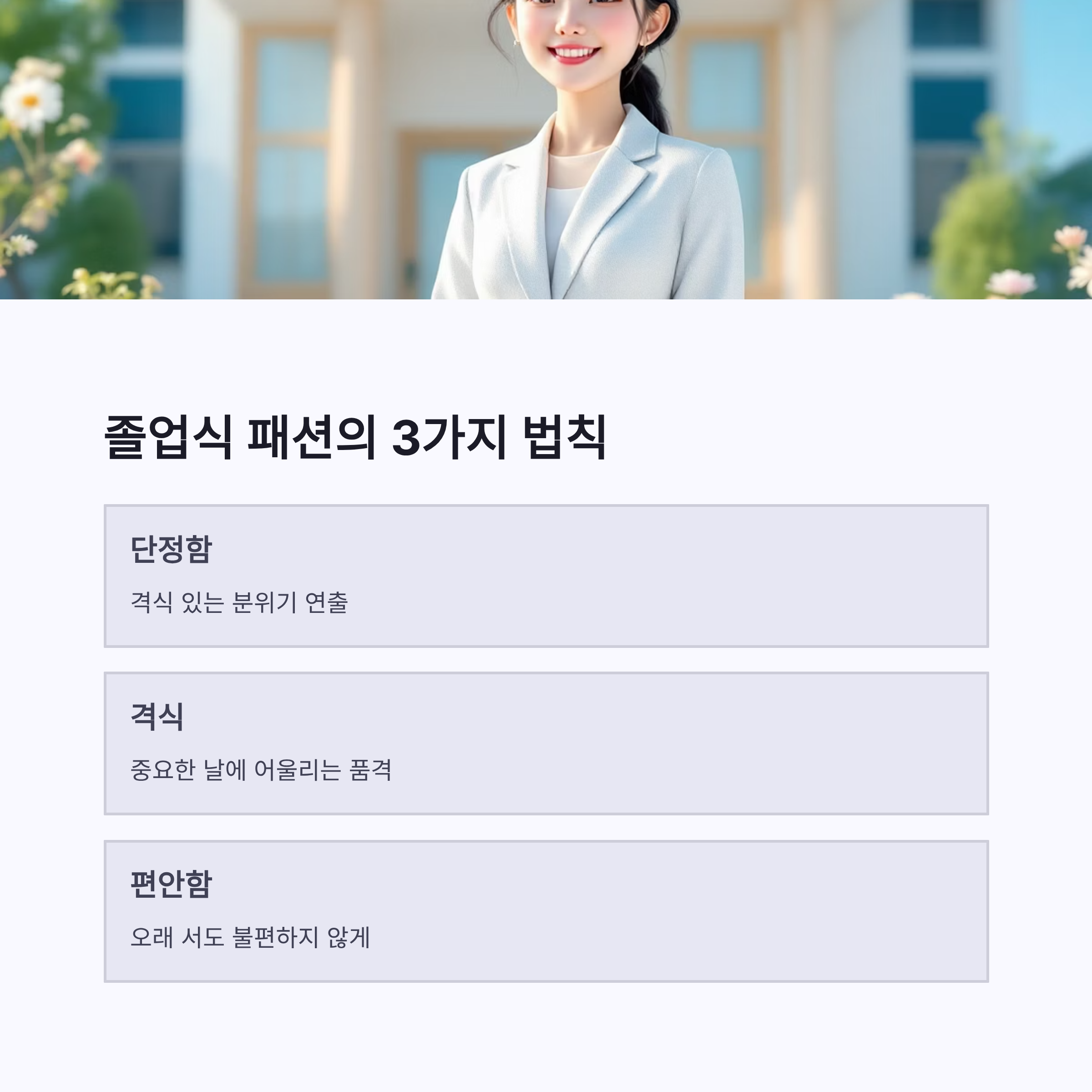 결론적으로 학부모 졸업식 패션은 튀지 않게, 대신 허술하지 않게가 핵심이더라구요. 무채색 기본 + 단정한 실루엣 + 편한 착용감 이 조합이면 실패 확률 거의 없습니다. 아이의 중요한 날인 만큼, 부담 없이 예쁘게 기억 남기는 게 최고 아닐까 싶어요. 여러분은 어떤 스타일이 제일 고민되시나요?