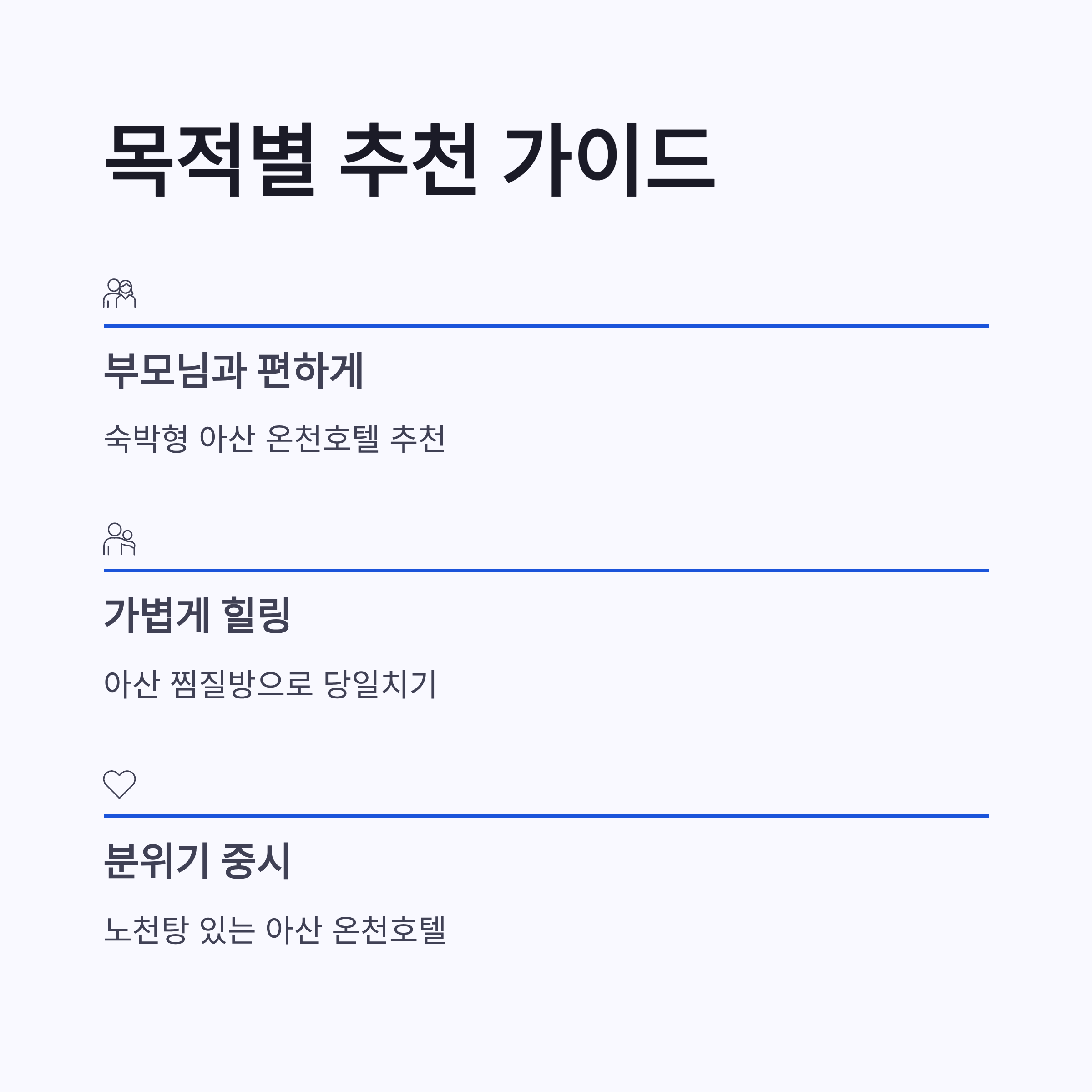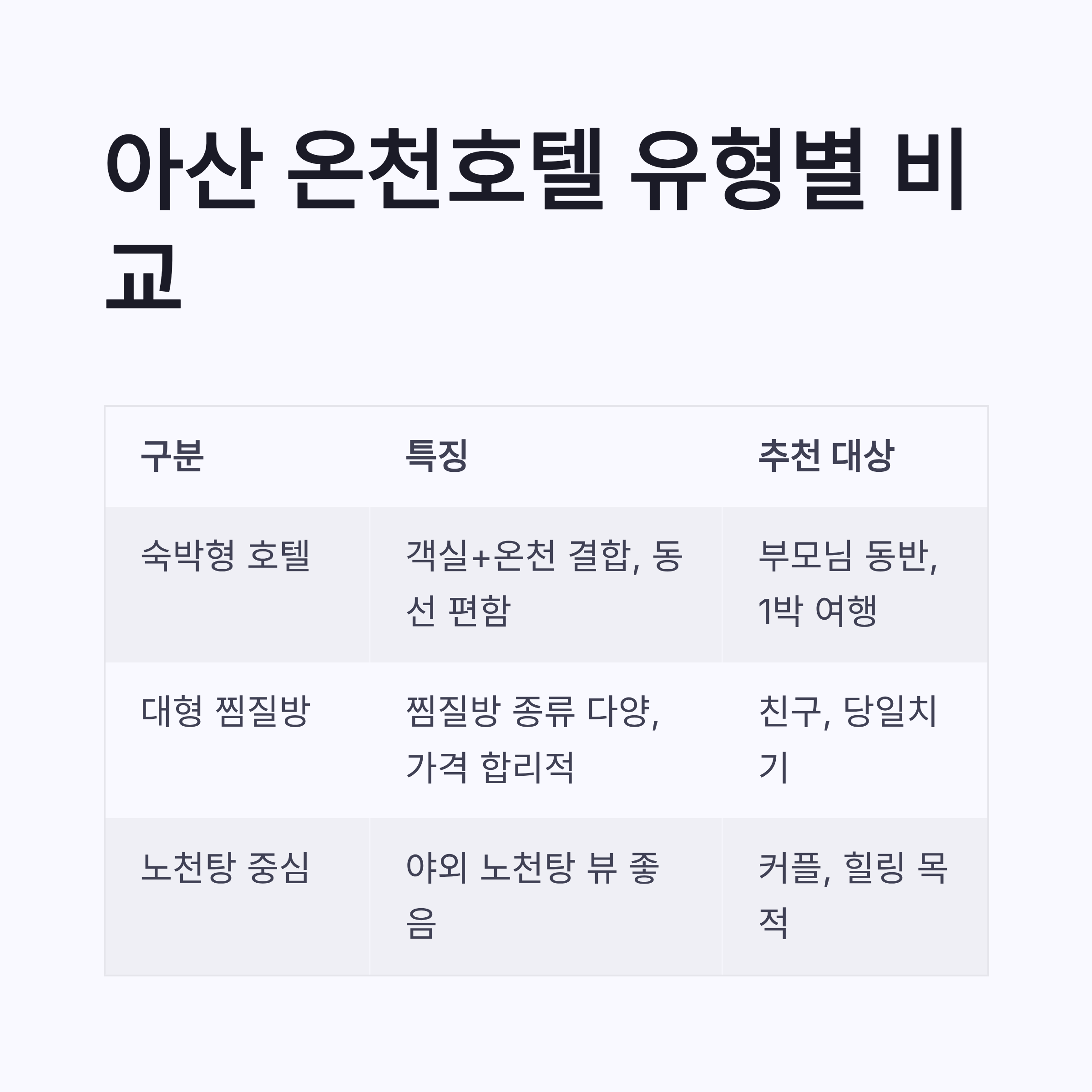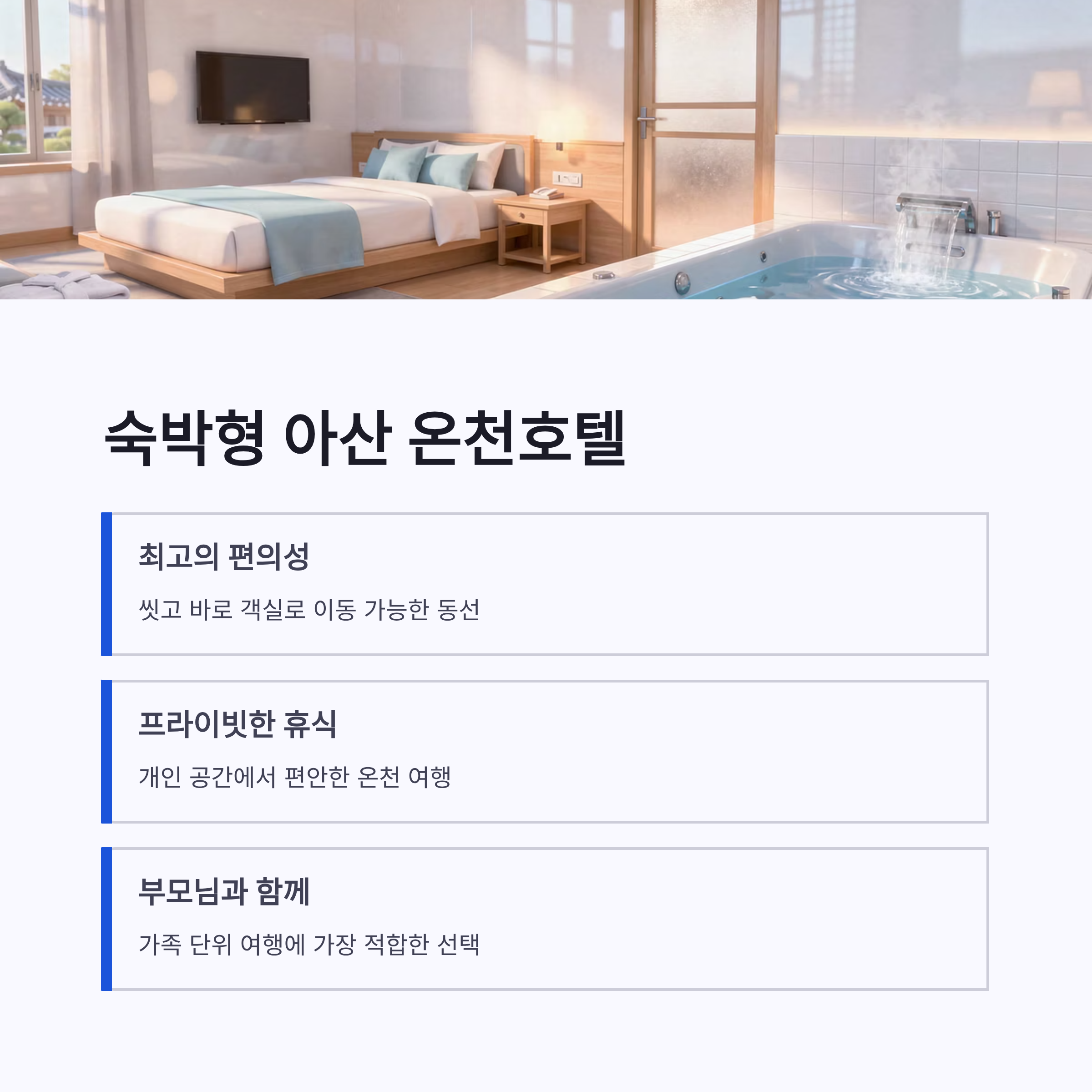 | 아산 온천호텔 숙박형 | 객실+온천 결합, 동선 편함 | 부모님 동반, 1박 여행 |