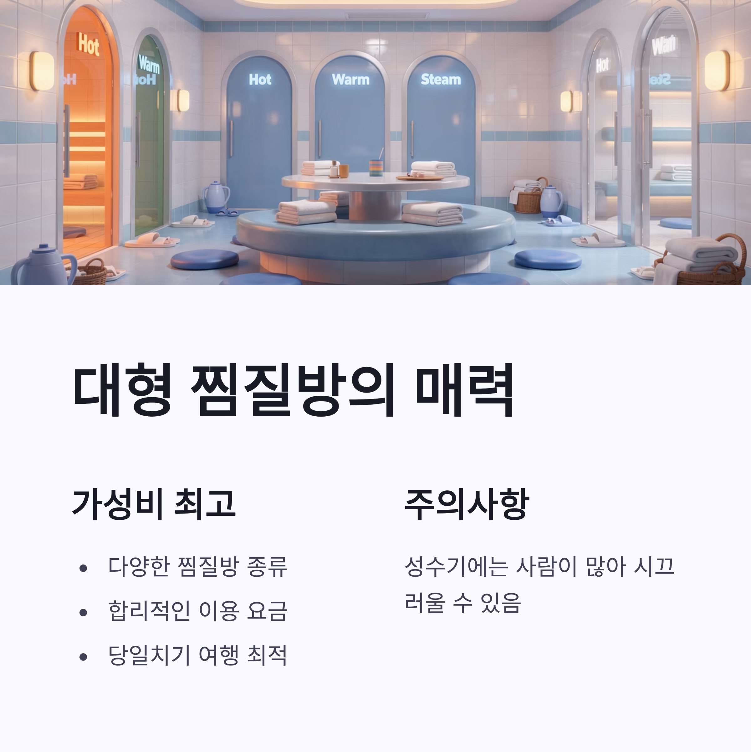 | 아산 찜질방 대형 | 찜질방 종류 다양, 가격 합리적 | 친구, 당일치기 |