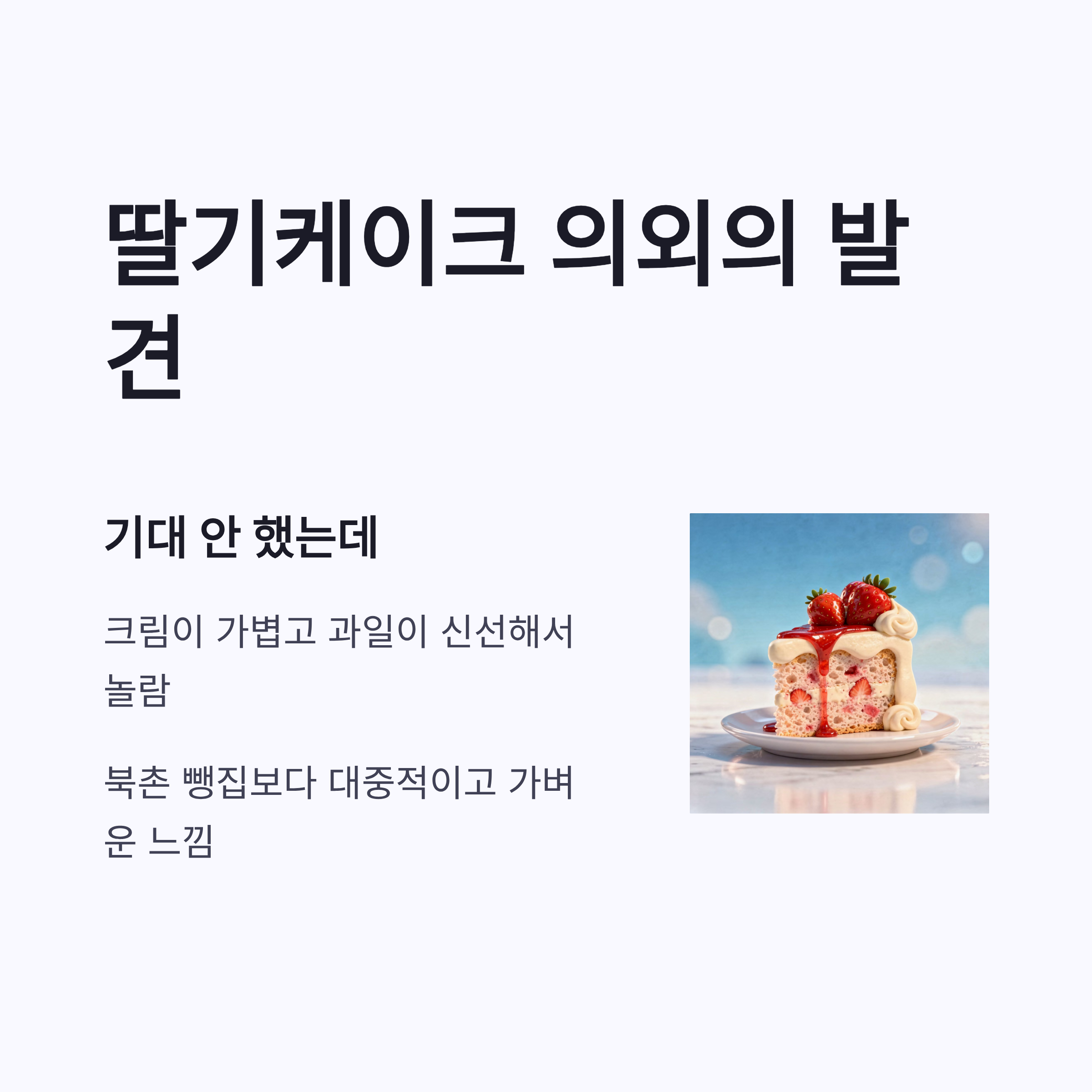 | 딸기케이크 | 7천원대 | 크림 가벼움, 과일 신선 |