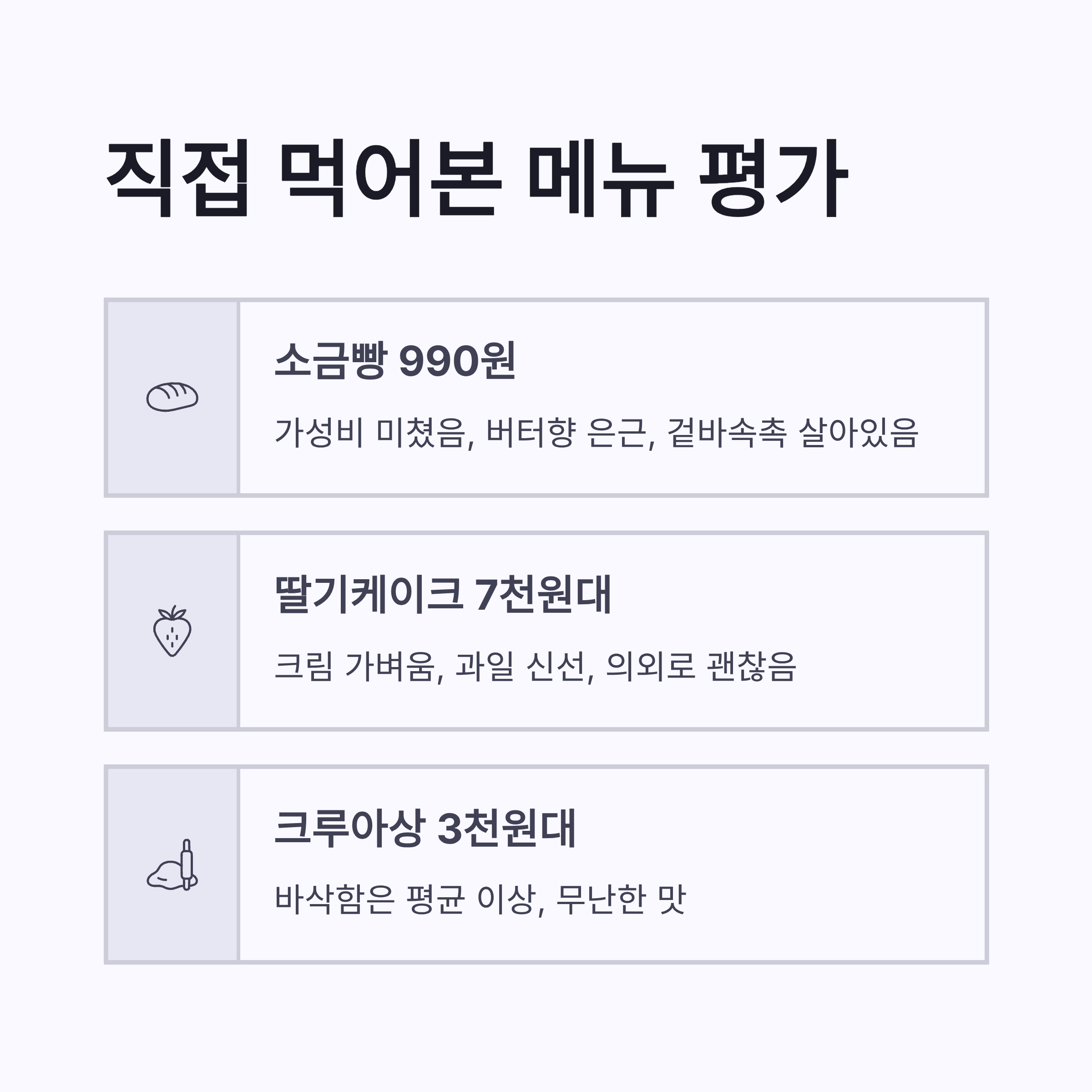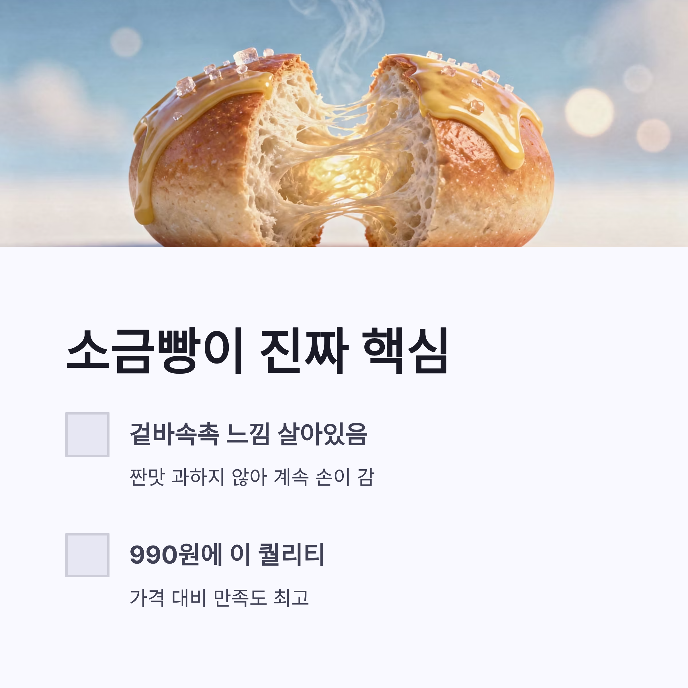 | 소금빵 | 990원 | 가성비 미쳤음, 버터향 은근 |