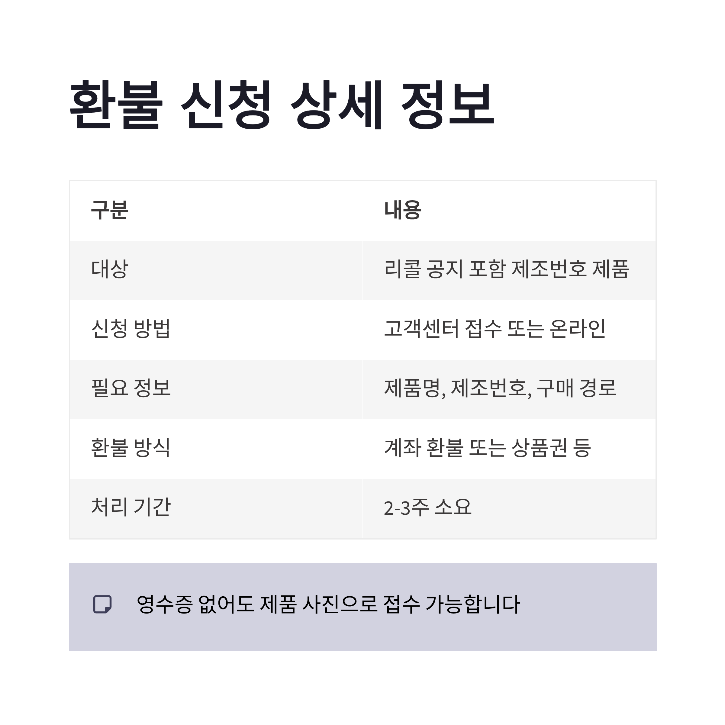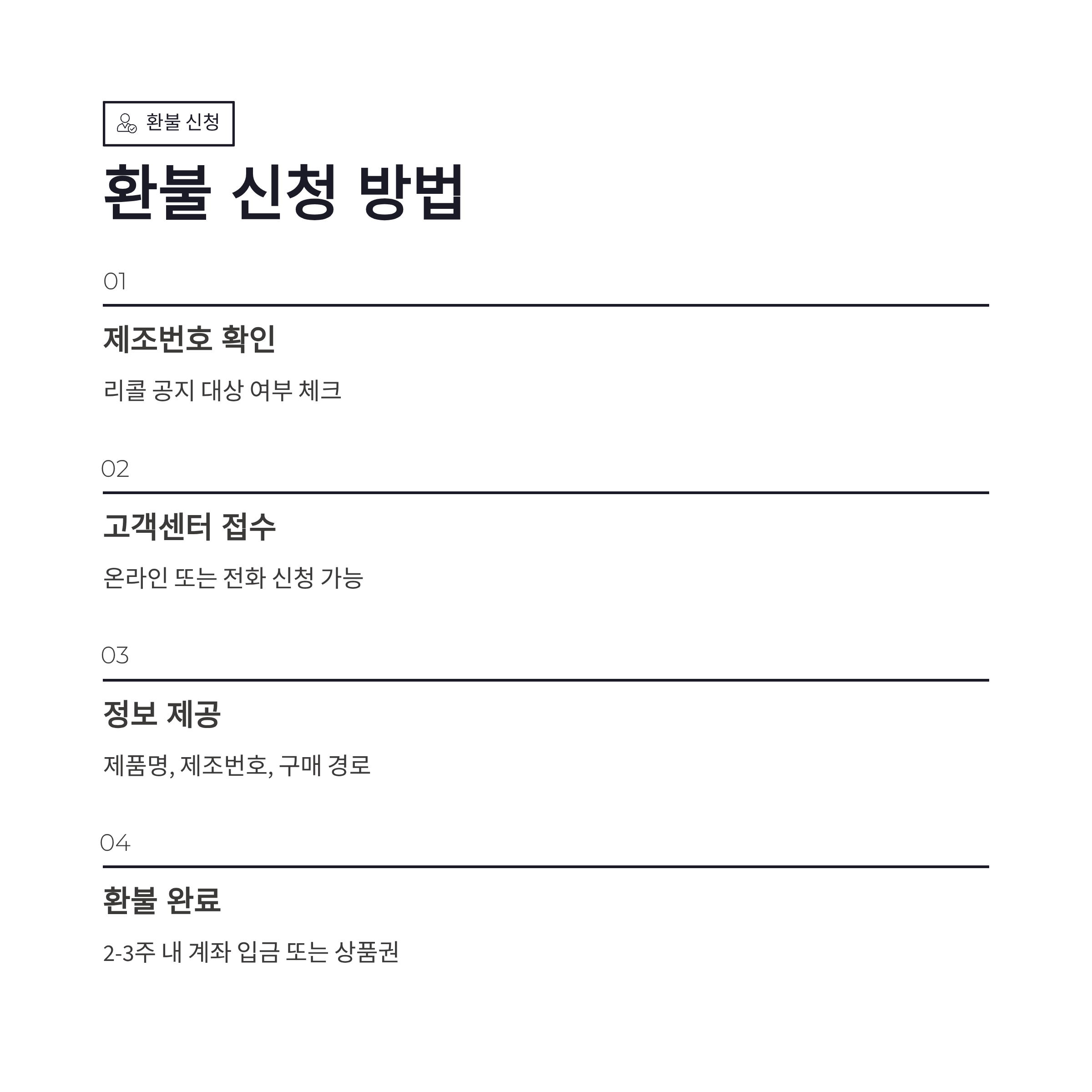 | 필요 정보 | 제품명, 제조번호, 구매 경로 |