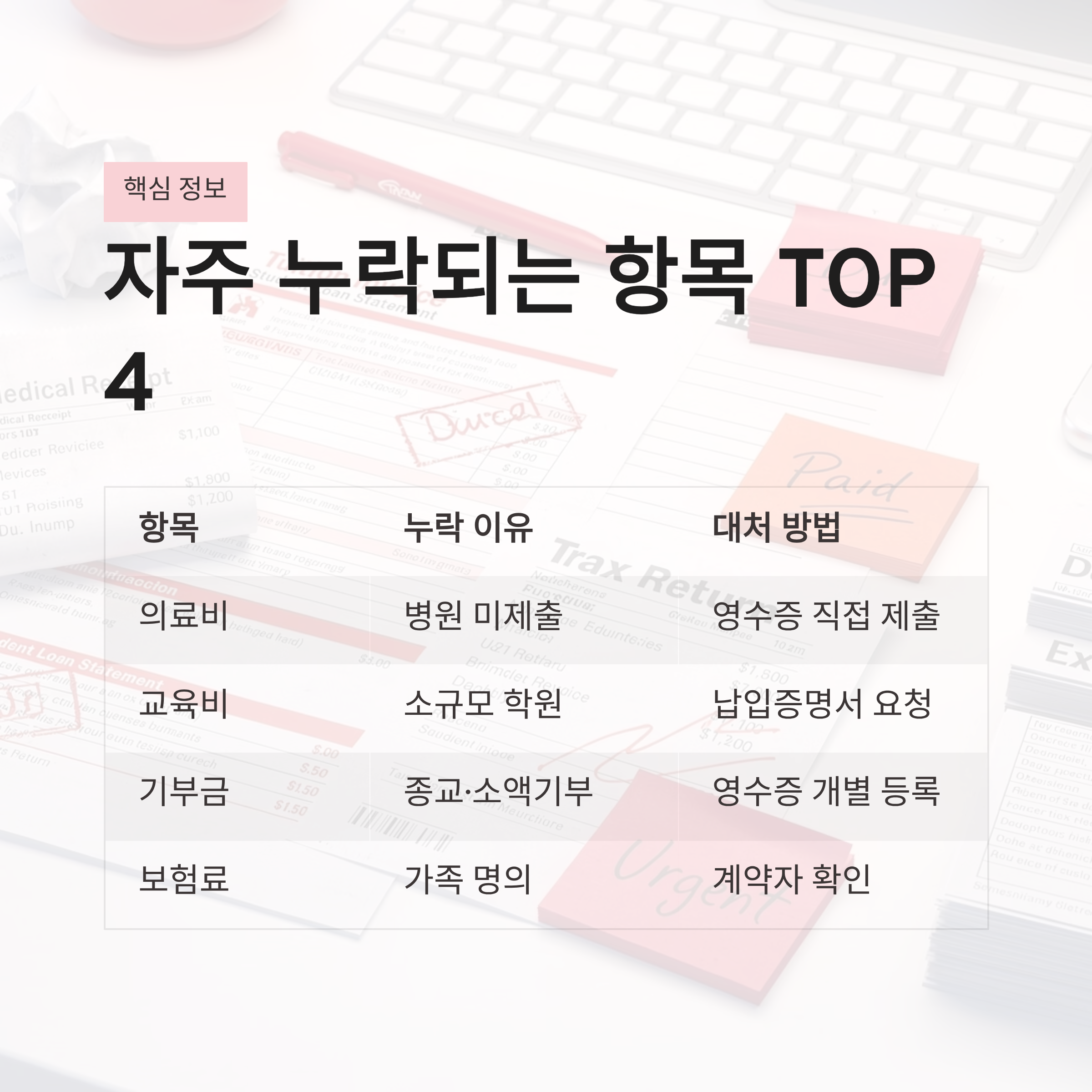 | 의료비 | 병원 미제출 | 병원·약국 영수증 직접 제출 |