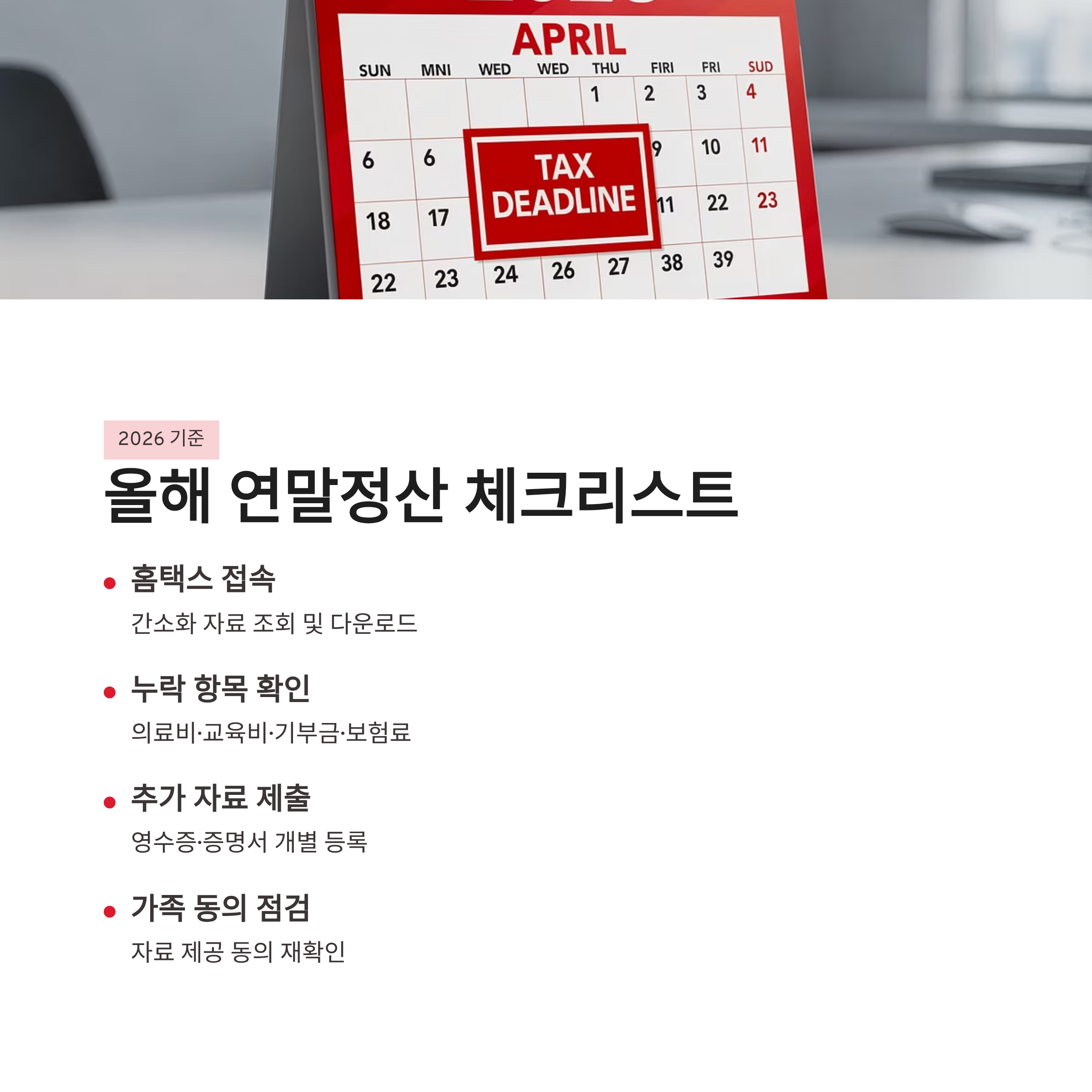 #연말정산 #연말정산간소화 #연말정산누락 #홈택스 #의료비공제 #교육비공제 #기부금공제 #보험료공제 #연말정산팁 #직장인연말정산 #세금환급 #연말정산확인 #소득공제 #세액공제 #2026연말정산