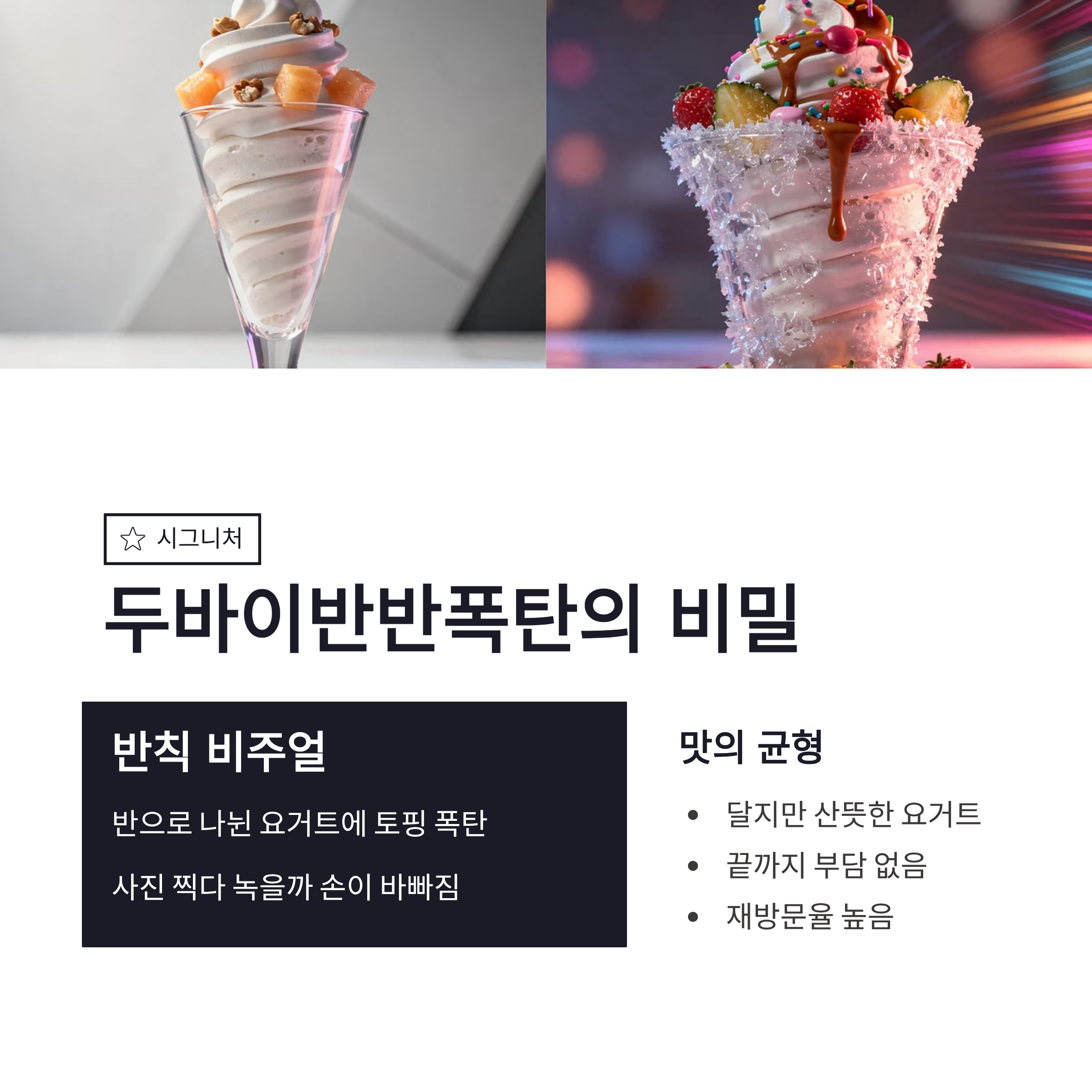 | 시그니처 | 두바이반반폭탄 | 반반 구성 + 토핑 가득 | 사진 맛집, 재구매 높음 |