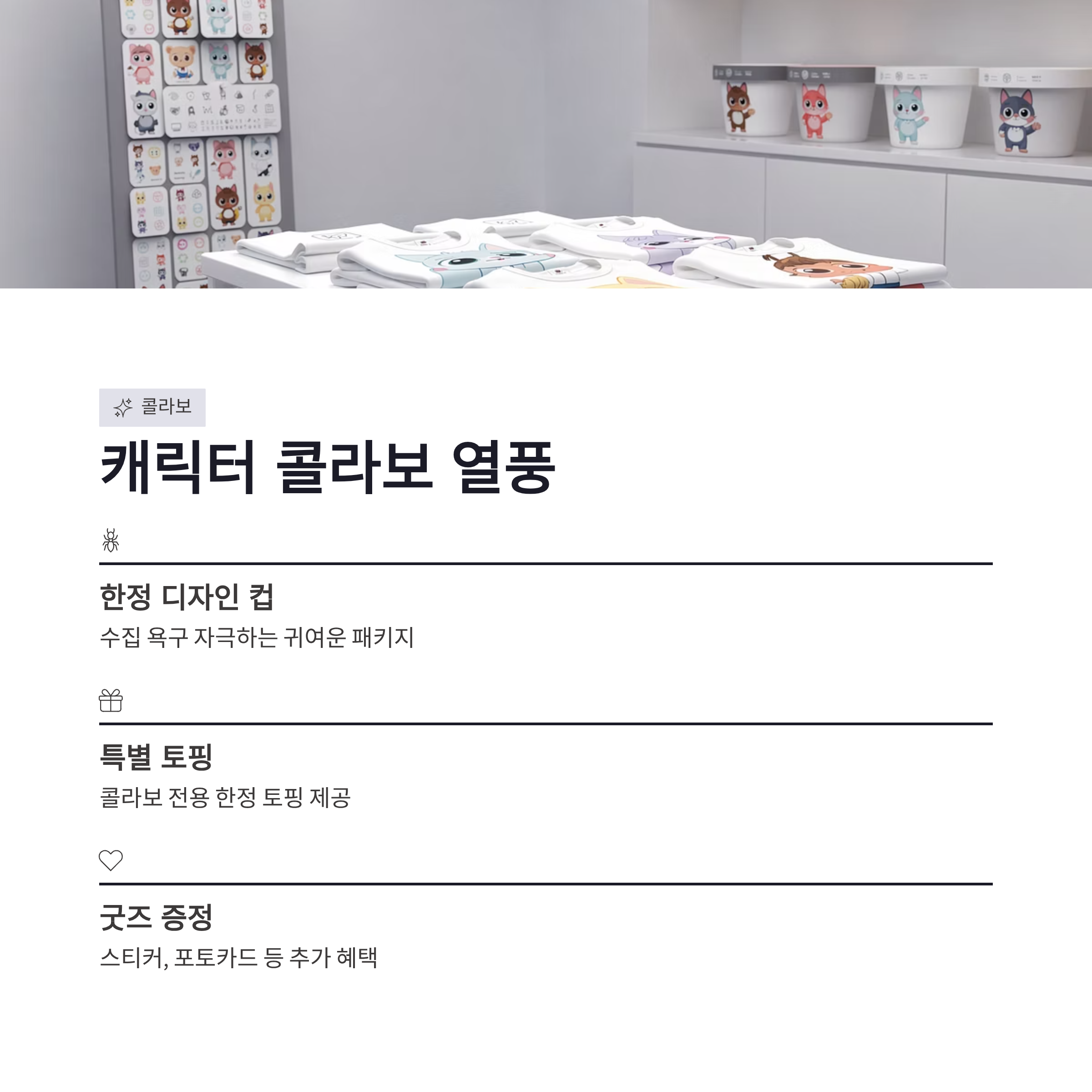 | 콜라보 | 캐릭터 한정 | 굿즈 포함 | MZ 반응 좋음 |