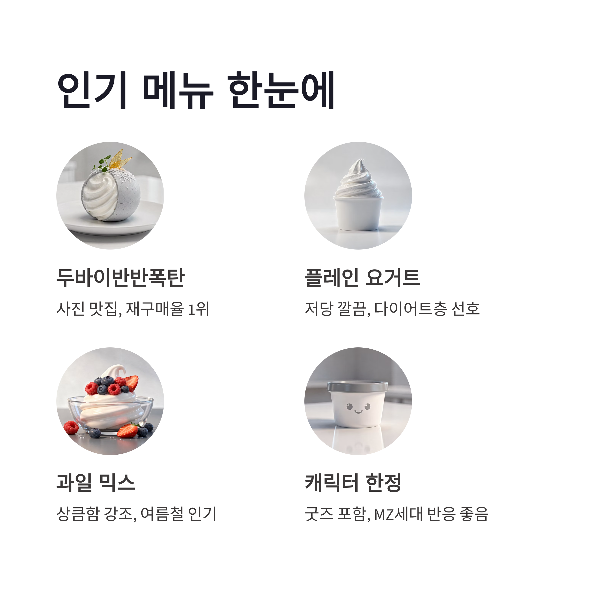 요거트월드가 잘하는 지점은 메뉴 선택의 재미 같았어요. 기본 베이스는 심플한데, 토핑 조합에 따라 완전 다른 디저트가 되더라구요. 저도 갈 때마다 고민하다가 직원 추천으로 고르는 편인데, 실패 확률이 거의 없었슴다. 2026년 기준으로 체감상 많이 보이는 메뉴 흐름은 아래 같았어요.