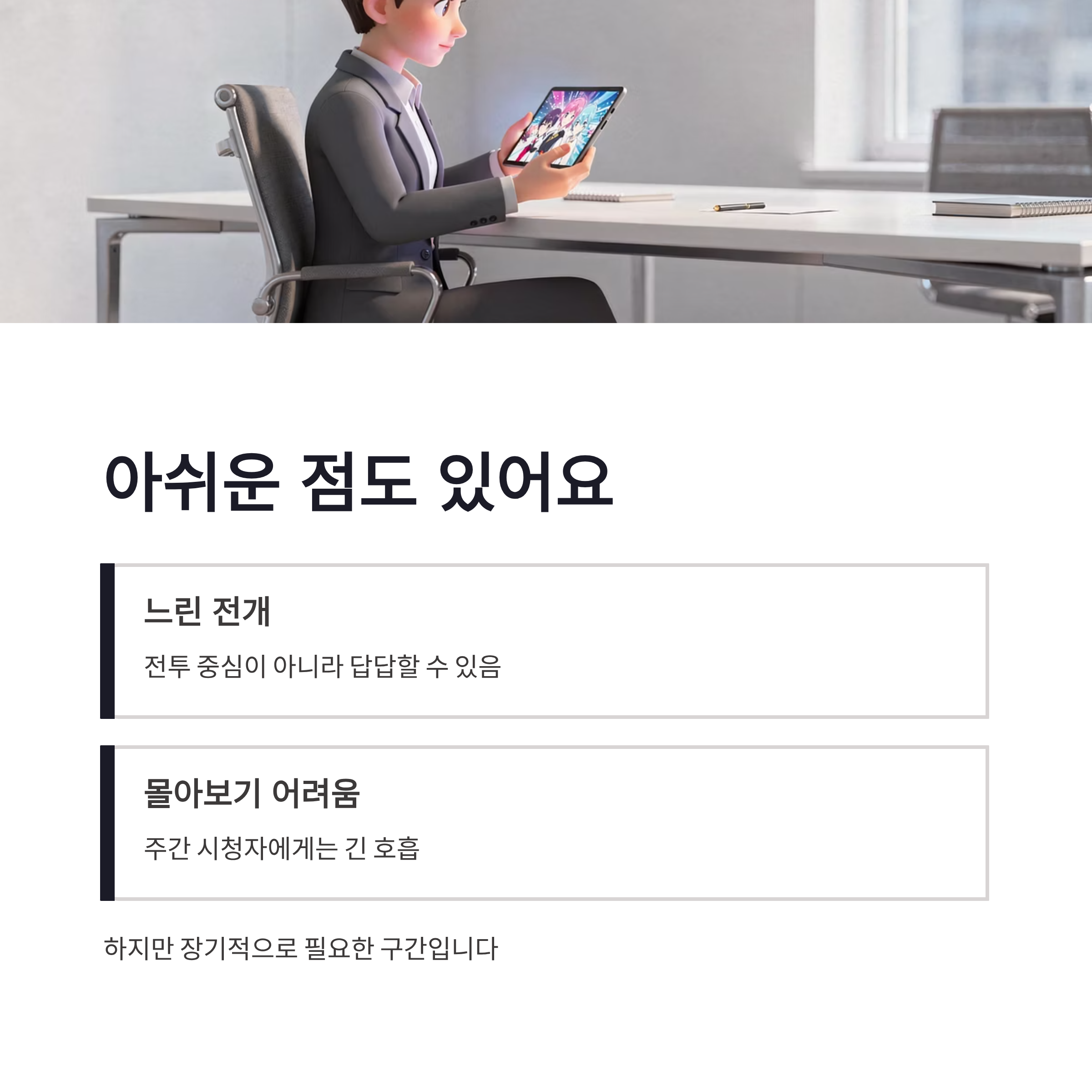 | 전개 | 빠른 전투보다 서사 중심 |
